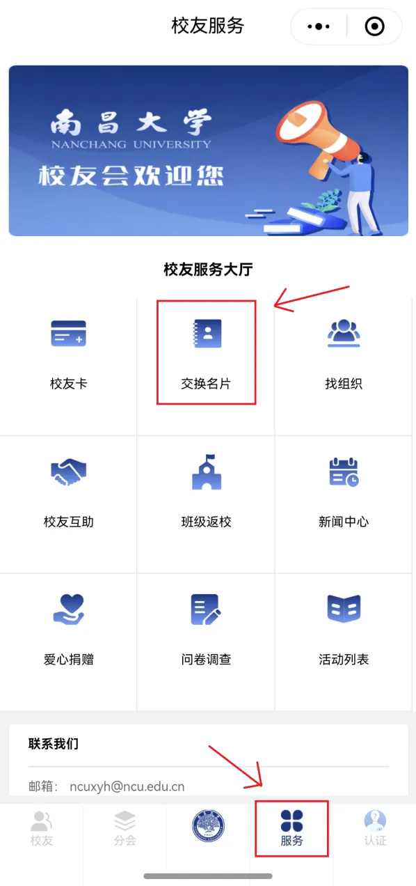 在校友活动、院系组织等多场景下自由交换电子名片,名片信息智能管理,人脉资源有序整合,为商务合作、学术交流、友谊延续搭建便 捷桥梁。