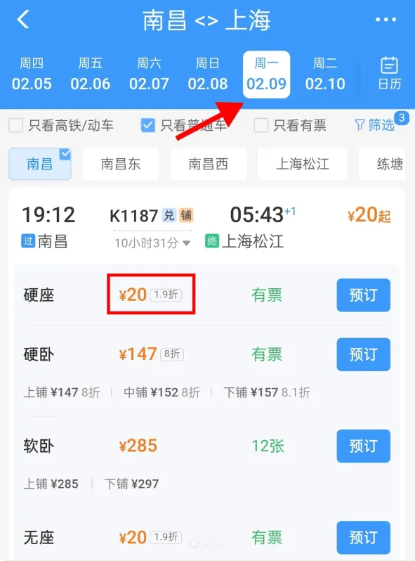 至上海松江硬座打1.9折、全程20元