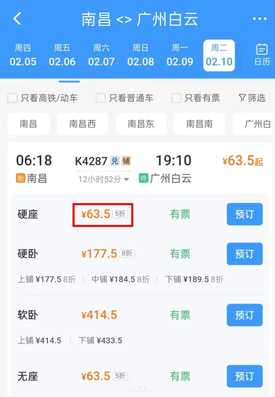 至广州白云硬座打5折、全程63.5元