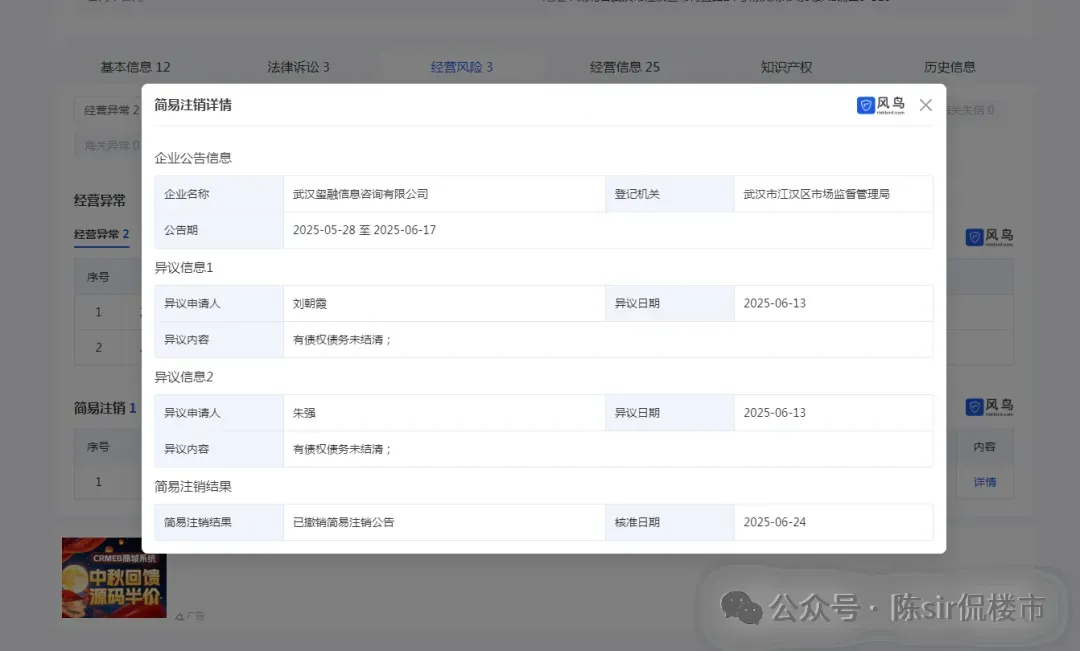1.武汉玺融信息咨询有限公司在存在民事纠纷情形下,通过简易程序注销,案件为朱强与武汉玺融信息咨询有限公司服务合同纠纷的案件,案号(2025)鄂0103民初8324号,但该公司通过注销公司,躲避法院执行,将公司资金非法转移。