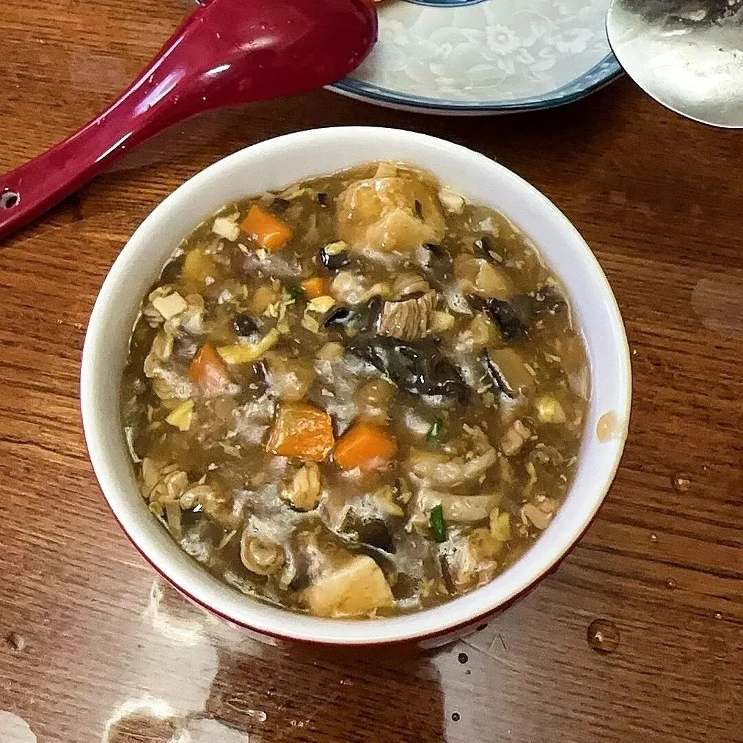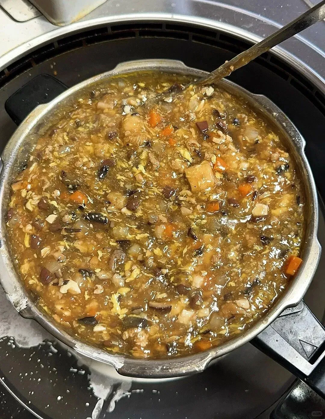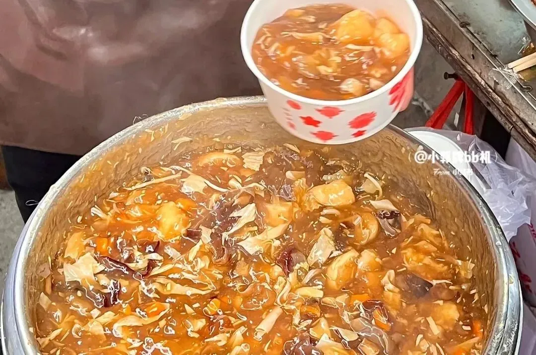 做这碗糊羹,讲究一个“杂”和“糊”。腊肉、香菇、荸荠、胡萝卜……十几种荤素食材统统切成小丁,先煸炒出香,再用浓郁鸡汤烧开,最后淋入红薯淀粉勾芡。一锅下来,汤汁稠滑浓鲜,各种食材的味道融在一起,吃之前再撒上一把白胡椒粉,那个香辣暖烫的劲儿,一口下去,从喉咙暖到胃里.
