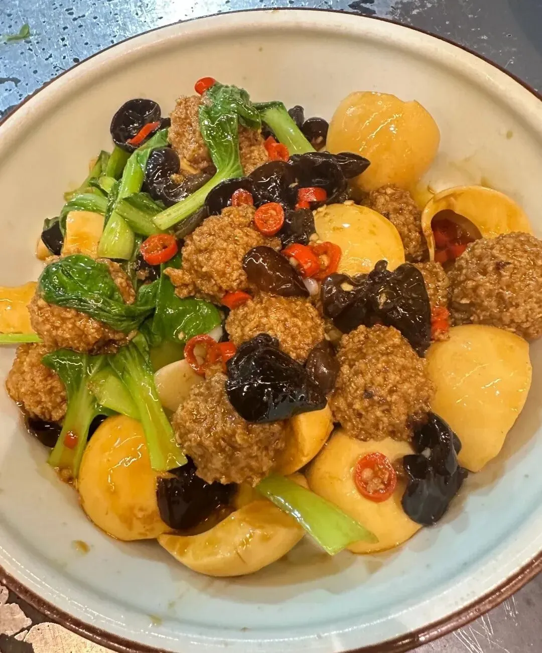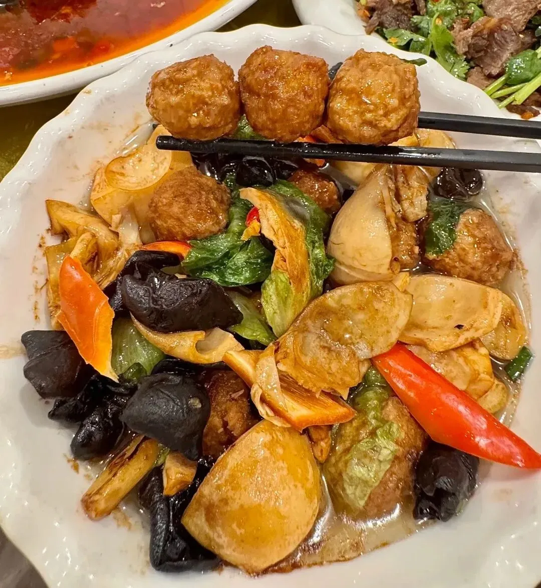 这道菜的精髓,在于一个“烧”字。所有食材在高汤里慢火焖烧,让味道互相渗透。最后上桌,一定是用保温的砂锅装,揭开盖子的瞬间,香气四溢。里面的白菜吸饱了汤汁,清甜软烂;自家炸的肉丸扎实弹牙;肉皮酥软,鹌鹑蛋入味……它没有张扬的辣,只有醇厚丰富的咸鲜。