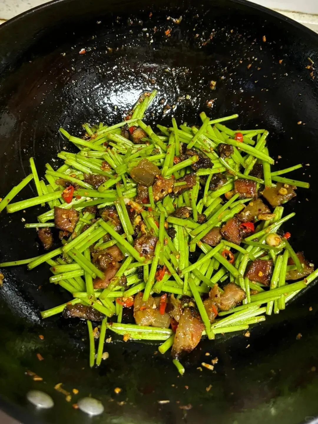 要做地道,非得用鄱阳湖的藜蒿根,择去叶子只留嫩茎,刮去老皮,掐成小段。腊肉则要选肥瘦相间的,先蒸熟,逼出油脂和咸香。烹饪时,用猪油旺火快炒,让腊肉的咸香和藜蒿的清香在高温中瞬间碰撞、融合。