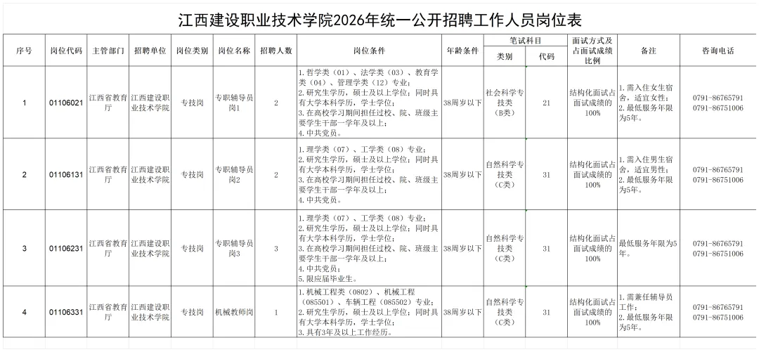根据事业单位公开招聘有关规定,现将江西建设职业技术学院2026年统一公开招聘工作人员有关事项公告如下: