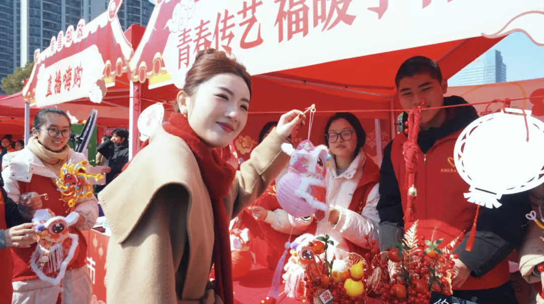 “青春手作”2月8日的热卖盛景,成为花市一道青春风景线。当天,共青团西湖区委组织“青英归巢”返家乡社会实践大学生开设青春手作铺,大学生们把乡情与巧思落地成一件件新春福饰——红纸剪纸纳马年福气、DIY中国结编织平安祝福、软萌毛绒糖葫芦摆件创意添趣,深受市民喜爱。