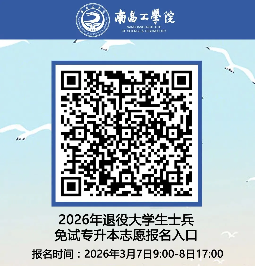 凡符合免试申请条件的退役大学生士兵于2026年3月7日—3月8日自行登录南昌工学院招生信息网(http://zsb.ncpu.edu.cn/)申请,按要求填写、上传个人基本信息(包括本人手机号)、专科毕业院校、报考专业、在校期间成绩(专科毕业成绩单)、服役期间的表现(服役自评,服役期间荣誉、奖励)、身份证照片、退伍证明照片等相关信息。(扫描下方二维码即可报名)