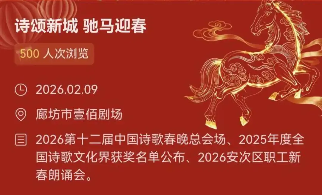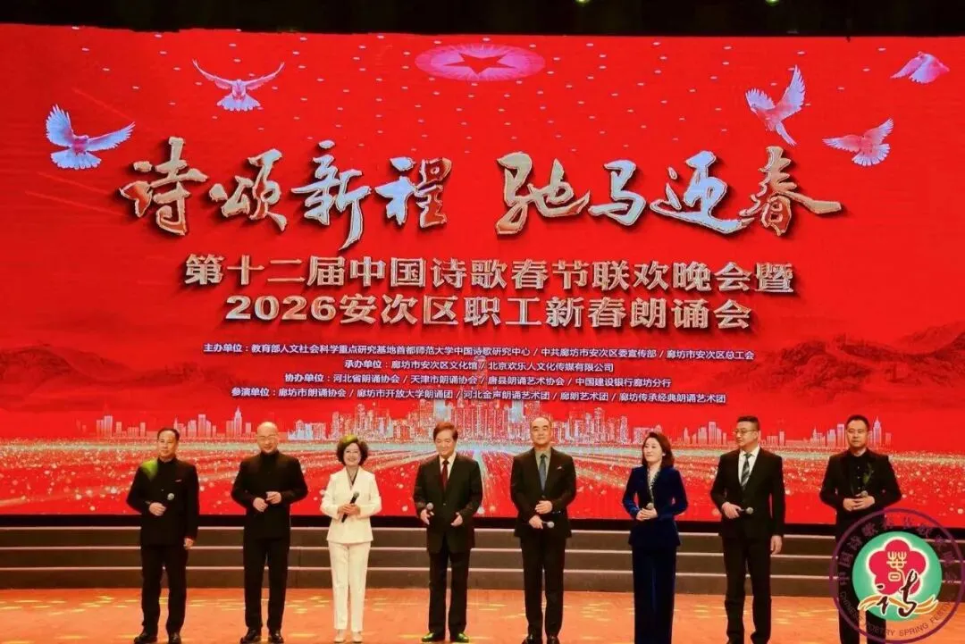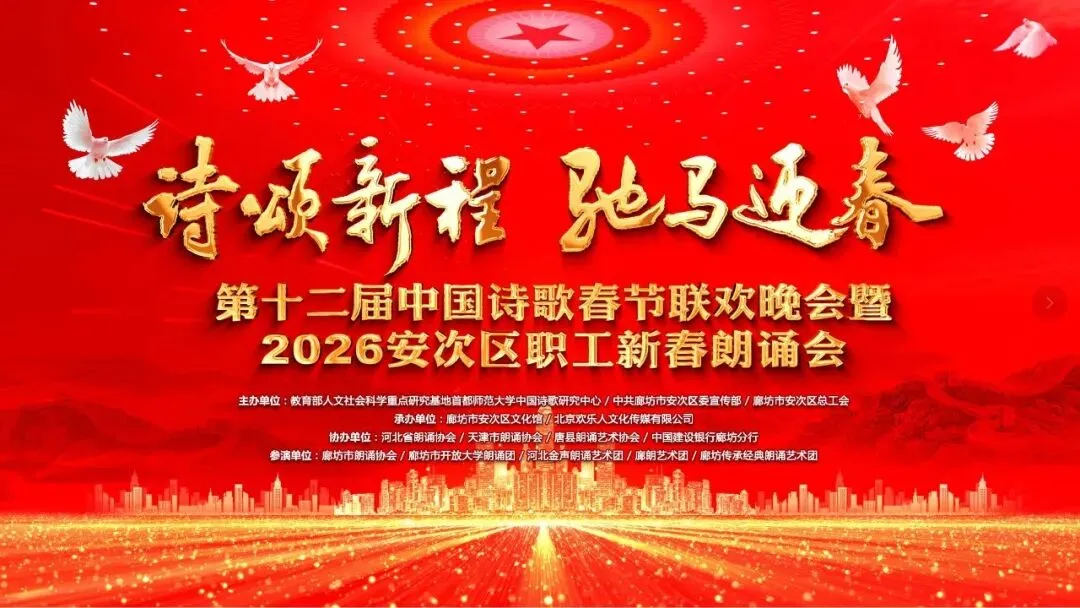 本次活动由教育部人文社会科学重点研究基地首都师范大学中国诗歌研究中心、中共廊坊市安次区委宣传部、廊坊市安次区总工会主办,廊坊市安次区文化馆、廊坊市壹佰剧院管理服务有限公司、北京欢乐人文化传媒有限公司承办,河北省朗诵协会、天津市朗诵协会、唐县朗诵艺术协会、中国建设银行廊坊分行协办。(2026、2、9)