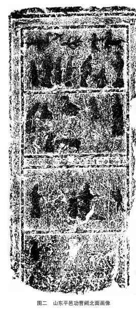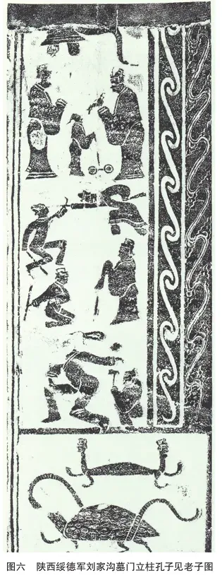 孔子见老子图不仅在上述山东、河南地区有,在陕西靖边杨桥畔东汉壁画墓(图五)、绥德军刘家沟东汉画像石墓(图六)、内蒙古和林格尔东汉护乌桓校尉壁画墓(图七)、四川新津东汉画像石棺(图八)上都有,分布范围较为广泛。由此可知,这个故事在东汉时期的民间影响力是比较大的。
