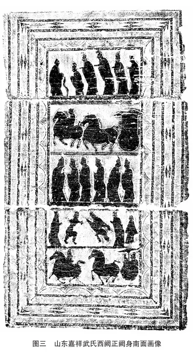 山东嘉祥武氏阙建于建和元年(147年),孔子见老子图位于西阙主阙身南面上层,孔子率众弟子见老子,其间未刻项橐(图三)。孔子见项橐图位于西阙主阙身北面上层,只是他二人相会,未刻老子(图四)。