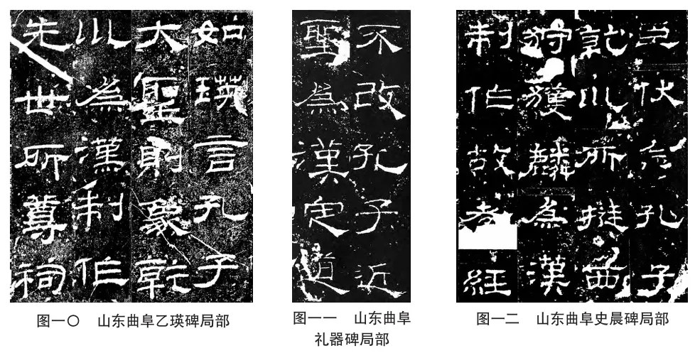 由此可知,这时的孔子庙已非孔氏自己的家庙,而是由孔子后裔褒成侯主持四时祭祀的官方祭孔之庙。碑文中称赞“孔子大圣,则象乾坤。为汉制作,先世所尊”(图一O)。永寿二年(156年)《礼器碑》中称赞“孔子近圣,为汉定道”(图一一)。建宁二年(169年)《史晨碑》中载,史晨“伏念孔子,乾坤所挺,西□□麟,为汉制作”(图一二)。序文之后碑铭则对孔子的一生进行了总结,最后赞其“魏魏荡荡,与乾比崇。”由碑阴文可知,自桓帝永兴元年在孔庙置百石卒史管理孔庙礼器之后,至灵帝建宁时,鲁相史晨“又勒渎井复民,餝治桐车马,于渎上东行道表南北各种一行梓。假夫子冢、颜母井舍及鲁公冢守吏凡四人,月与佐除。”官方为孔渎边道路种树,派人为孔子冢、颜母井舍及鲁公冢看守。