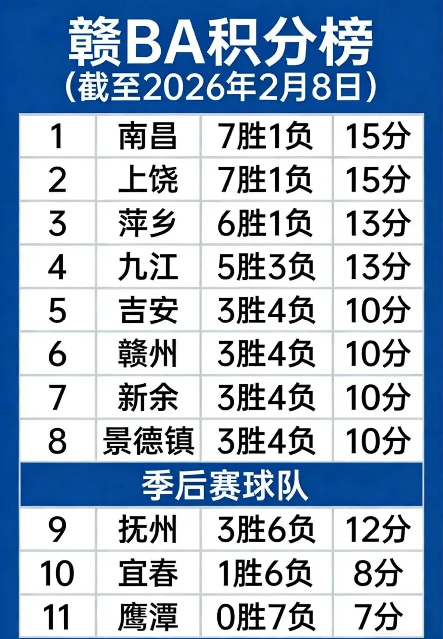 “赣鄱烽火燃八轮,积分榜上见真章!”截至2月8日,2026赣BA常规赛第八轮战罢,最新积分榜正式出炉。南昌与上饶以7胜1负的战绩领跑,萍乡、九江紧随其后,而中游四队同积10分陷入混战,让季后赛看点十足。