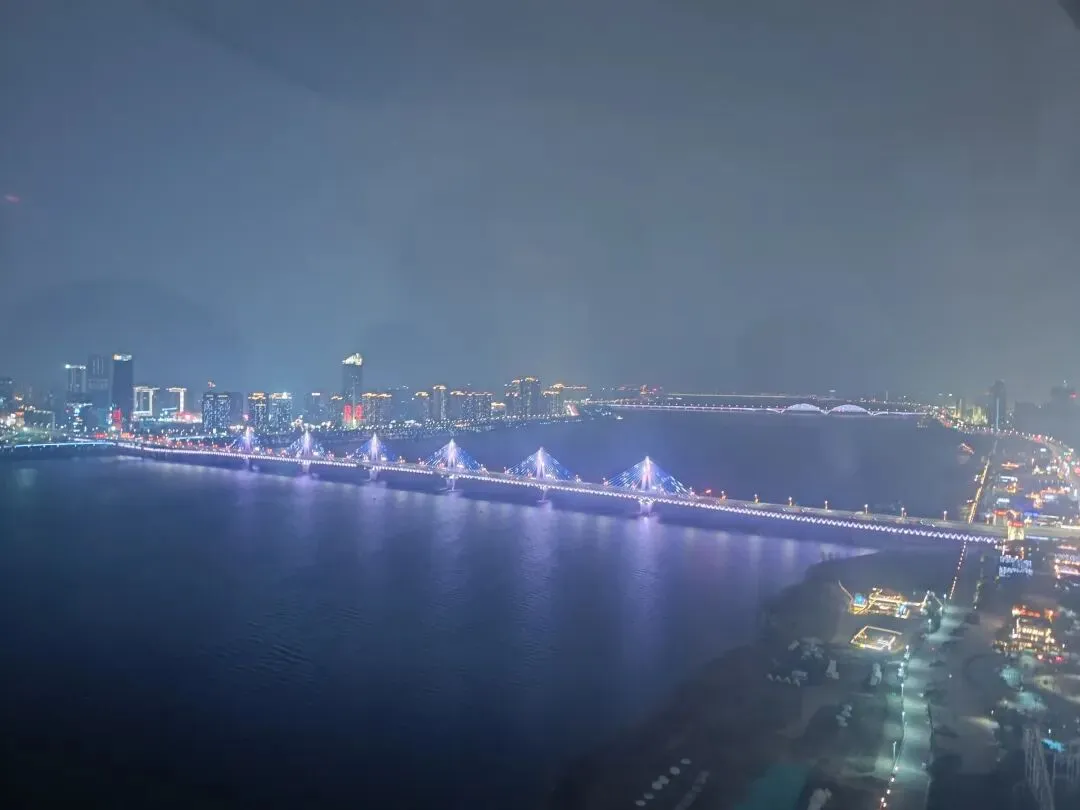 抵达红谷滩新区时,天色渐暗。远远望去,“南昌之星”巨大的银色轮盘已亮起点点星光,与对岸的滕王阁遥相呼应,如同时空对话。一旁的“万象城”商场灯火通明,为等待的游客提供了歇脚之处。古今辉映:江北岸,滕王阁通体明亮,在夜色中勾勒出唐风宋韵的庄严轮廓;江南岸,红谷滩的现代楼宇群则闪耀着冷峻的金属光泽,其中高耸的“双子塔”尤为醒目。桥如飞虹:更远处,八一大桥、朝阳大桥等化身为数道飞跨两岸的光带,川流不息的车灯绘成流动的光河。