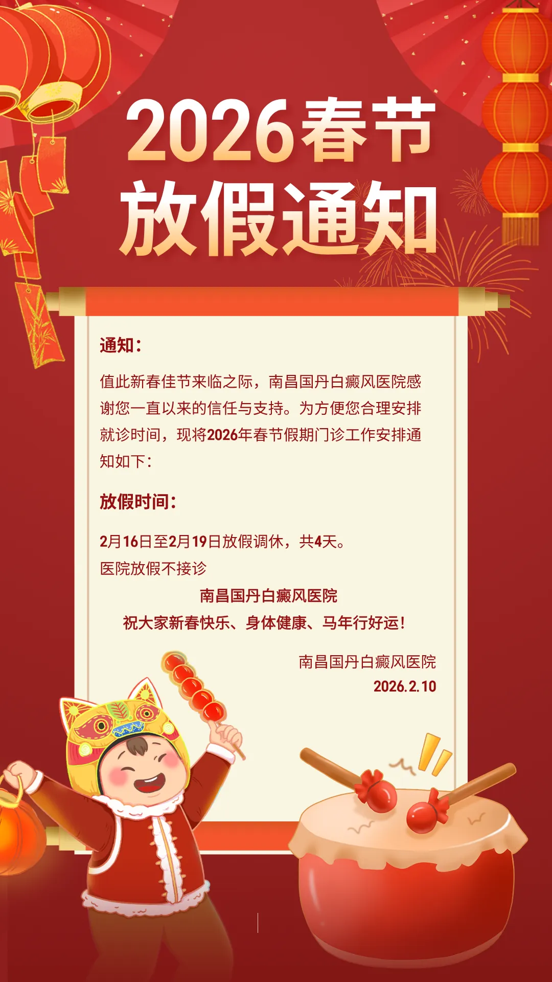 值此新春佳节来临之际,南昌国丹白癜风医院感谢您一直以来的信任与支持。为方便您合理安排就诊时间,现将2026年春节假期门诊工作安排通知如下: