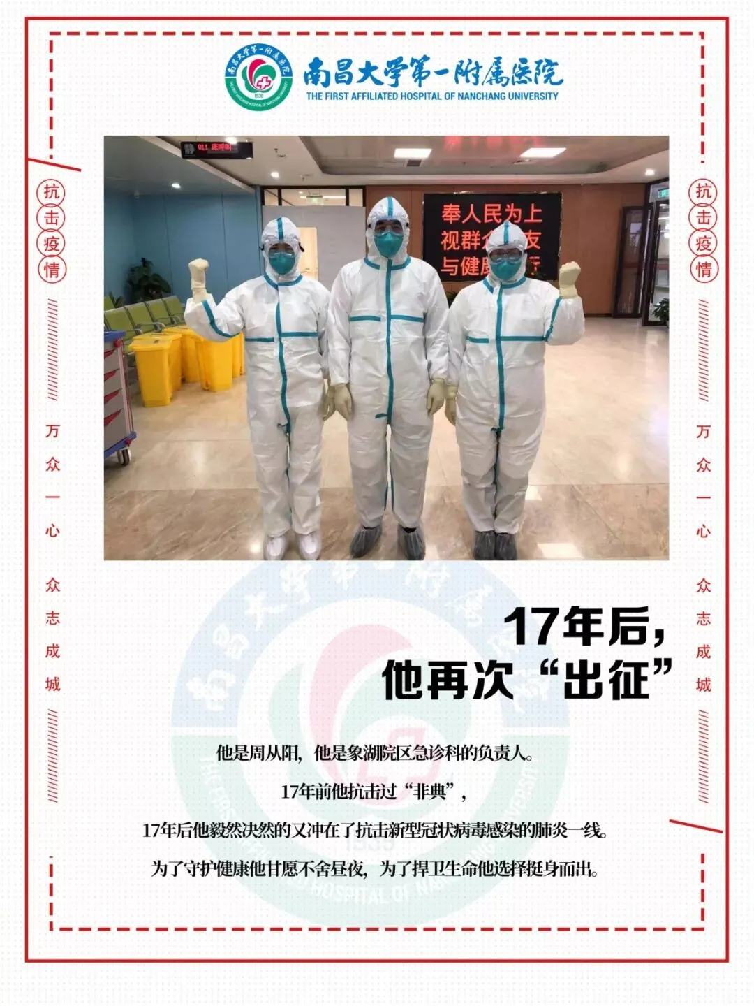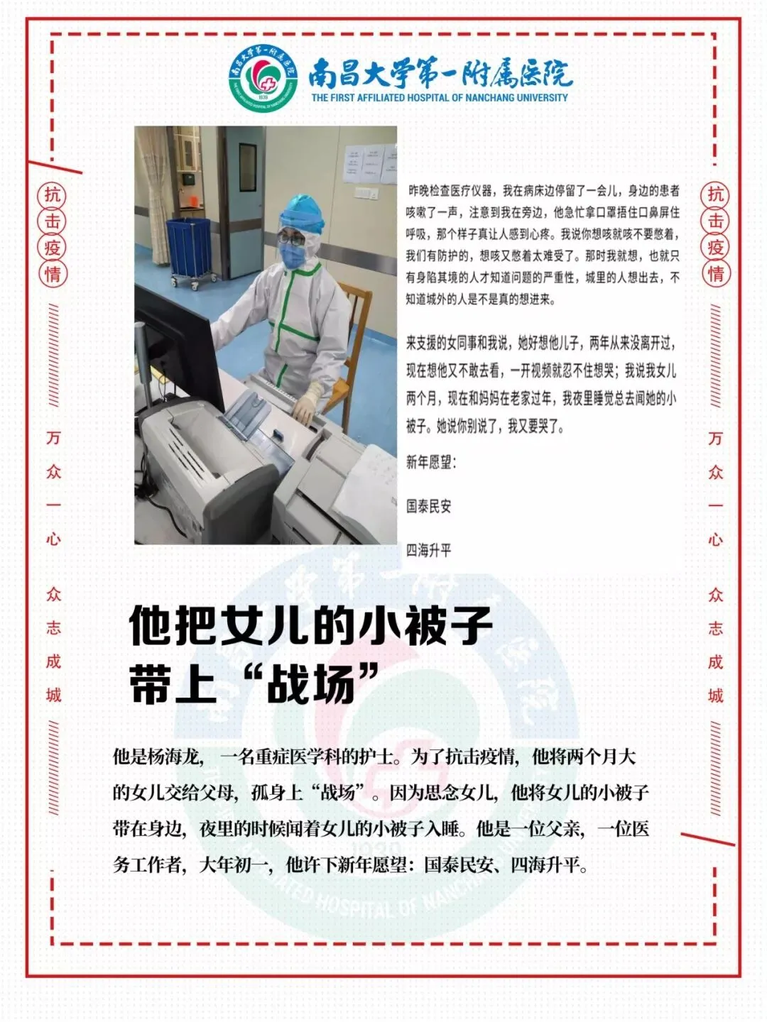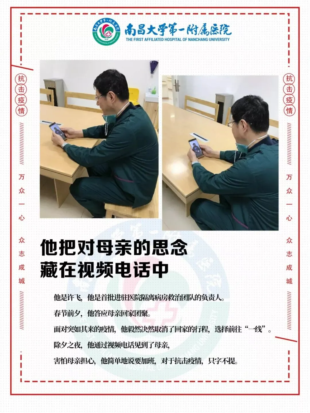 “这次春节,答应了母亲一定回去看她,可没想到我又失约了。”周从阳的母亲已经86岁高龄,虽然知道儿子作为一名医生非常繁忙,但过春节仍从心底里盼望儿子归家。南大一附院象湖院区急诊科于2019年10月8日正式试运行,为了保证病人的健康,周从阳选择坚守岗位,整整100天驻扎在象湖院区,没有回家。得知南大一附院成为“新型冠状病毒感染的肺炎省级医疗救治定点医院”后,周从阳选择放弃春节休假,带领急诊科的医护人员随时待命。“每一个医生都有同一个愿望,那就是竭尽全力让患者平安。我曾经抗击过非典,我有经验,要留下来我义不容辞。”17年前,周从阳在隔离病房与“非典”较量了67个日夜,17年后面对新型肺炎疫情,他觉得自己更有责任挑起这份重担。许飞是南大一附院呼吸与危重症医学科副主任,春节前,他提前向领导请好假,准备一家三口回老家陪母亲过年。然而计划不如变化,突如其来的疫情打乱了一切。许飞接到任务后,毅然取消了回家的行程,选择值守“一线”,与病魔作战。全身消毒、“全副武装”的许飞一忙起来就顾不上家,不眠不休是常事。为了节省一次性防护服,许飞和同事们常常一坚持就是好几个小时,不喝水不上卫生间,浑身大汗淋漓,连护目镜里都氤氲着水汽。父亲才去世不久,许飞实在放心不下孤身一人在老家的母亲。吃饭间隙,他和母亲视频,只说医院春节太忙要加班,承诺年后一定抽空回去探望,对于自己在一线抗击疫情却只字未提。作为一名新晋“奶爸”,杨海龙育儿技术尚未熟练就不得不与女儿分离。带着女儿的小被子奋战前线的他,默默祈愿国泰民安、四海升平,希望通过自己的微薄之力,让更多的家庭幸福、团圆。“哪有什么白衣天使,不过是一群孩子,换了一身衣服,学者前辈的样子治病救人,和死神抢人罢了……”在父母们眼里,这些“90”后还是会撒娇的孩子,但在患者面前,他们就是值得信赖的天使。生活当中,他们是父母的孩子,是孩子的父母,是和你我一样想着粮食和蔬菜的普通人;疫情面前,他们肩扛责任、义无反顾,是和时间赛跑、与死神抢人的白衣战士。值此新春,让我们致敬“逆行者”,感谢你们危难之时挺身在前,用自己的奉献和牺牲,保卫百姓健康,守护万家团圆。疫情防控 | 江西师大、科师大、赣南师大、上饶师院、南昌师范、豫章师范在行动