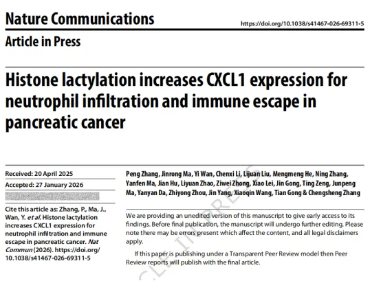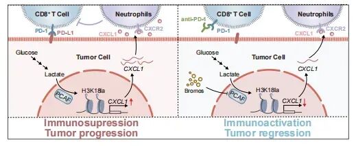 胰腺癌常被称为免疫治疗的“硬骨头”,即便在其他肿瘤中表现亮眼的免疫检查点阻断治疗,在胰腺癌里也往往难以取得理想效果。近日, 南昌大学附属第一医院张呈生教授团队在 Nature Communications 发表研究 论文《Histone lactylation increases CXCL1 expression for neutrophil infiltration and immune escape in pancreatic cancer》 ,聚焦肿瘤代谢与表观遗传的交叉点,揭示了肿瘤细胞产生的乳酸如何通过一种新近受到关注的组蛋白修饰,驱动免疫抑制并促进免疫逃逸,同时给出可操作的联合治疗策略。第一作者:Peng Zhang, Jinrong Ma, Yi Wan, Chenxi Li, Lijuan Liu研究首先把目光放在胰腺癌典型的有氧糖酵解。团队在小鼠胰腺癌模型中使用经典糖酵解抑制剂 2DG,发现肿瘤内乳酸水平显著下降,同时肿瘤生长受到抑制。更关键的是,肿瘤免疫微环境随之发生重塑。CyTOF 与流式结果一致显示,2DG 处理后肿瘤浸润中性粒细胞减少,而 CD8+ T 细胞显著增加,这一趋势在原位移植模型中同样成立,且肿瘤内杀伤型 GZMB+CD8+ T 细胞比例更高。为了排除药物对非肿瘤细胞的直接影响,团队进一步在肿瘤细胞中敲低乳酸脱氢酶基因,得到与 2DG 类似的结果,肿瘤负荷减轻,中性粒细胞减少而 CD8+ T 细胞富集。 进一步的功能学验证把“中性粒细胞介导免疫抑制”落到实处。研究通过抗体耗竭肿瘤相关中性粒细胞,观察到肿瘤生长被抑制,同时 CD8+ T 细胞的丰度与功能状态得到恢复。随后再耗竭 CD8+ T 细胞,这种由中性粒细胞耗竭带来的抑瘤效应被“救回”,提示该效应依赖 CD8+ T 细胞的抗肿瘤作用。接下来,研究把机制线索指向趋化因子。RNA 测序显示,在 2DG 处理后,Cxcl1 是变化最显著的差异趋化因子之一。结合 TCGA 数据分析,Cxcl1 在胰腺癌患者中高表达并与不良预后相关。 在细胞与动物水平上,抑制糖酵解会降低肿瘤细胞内 Cxcl1 mRNA 与细胞外 CXCL1 蛋白,肿瘤组织 IHC 也显示 CXCL1 下调。同时,肿瘤负荷小鼠血清 CXCL1 随 2DG 或乳酸脱氢酶敲低而下降。更贴近临床的是,胰腺癌患者血清 CXCL1 显著高于健康对照。乳酸如何把 CXCL1 “开关”拨到常开状态。团队将焦点放在组蛋白赖氨酸乳酰化这一新型表观修饰。结果显示胰腺癌组织中总体乳酰化水平升高,其中 H3K18la 变化最显著。 通过 2DG 处理或乳酸脱氢酶敲低,PanKla 与 H3K18la 均下降,而补充乳酸可把 H3K18la 拉回去,证明这一修饰与糖酵解来源乳酸紧密相关。在证据链上,研究进一步用 CUT&Tag 绘制结合图谱。2DG 处理后,H3K18la 在转录起始位点附近的峰显著减少,并锁定一批在 2DG 下同时出现转录下调与启动子 H3K18la 信号下降的候选基因,Cxcl1 位居其中。 研究还在 21 例人胰腺导管腺癌样本中观察到 Cxcl1 与 H3K18la 的正相关,提示这一“修饰到转录”的连接在人组织中同样成立。谁在胰腺癌里“写入”H3K18la。团队筛选组蛋白乙酰转移酶相关抑制剂,发现 PCAF 抑制剂 bromosporine 可显著降低肿瘤细胞 H3K18la 水平,并呈剂量依赖关系。随后从结构对接到蛋白互作,再到基因敲低与体外酶学反应,研究证明 PCAF 能与乳酰辅酶 A 匹配并催化 H3K18 乳酰化,抑制或敲低 PCAF 会降低 H3K18la,同时使 Cxcl1 的 mRNA 与分泌蛋白水平下降。机制落地到治疗层面,研究给出了清晰的联合策略。团队在两种小鼠模型中评估 PCAF 抑制剂与 PD 1 抗体联用。在皮下模型中,联用带来更明显的肿瘤生长抑制,并伴随 Ki67 下降,中性粒细胞浸润减少与 CD8+ T 细胞浸润增加,同时肿瘤组织 H3K18la 降低、血清 CXCL1 下降。 在原位肿瘤模型中,联用不仅进一步降低肿瘤负荷,还在免疫层面表现出协同,肿瘤内中性粒细胞比例下降,CD8+ T 细胞上升,GZMB+CD8+ T 细胞更多,而耗竭表型 PD 1+CD8+ T 细胞更少。更重要的是,联用组小鼠生存期显著延长。这项研究把代谢产生的乳酸与表观遗传“写入”动作连接起来,提出一条可被概括为 乳酸 PCAF H3K18la CXCL1 的通路,解释了为何胰腺癌中性粒细胞浸润增强、CD8+ T 细胞受限,从而形成免疫抑制与免疫逃逸。 同时,研究以药理抑制 PCAF 为切入点,让胰腺癌的免疫治疗看到了更合理的联合方向,即先拆掉由乳酸驱动的中性粒细胞屏障,再放大 PD 1 阻断的效应,为后续转化研究提供了明确路径。https://www.nature.com/articles/s41467-026-69311-5免责声明:本公众号所发布的内容均为学术论文解读,仅用于科研交流、学术探讨及知识分享之用,不涉及任何商业用途。本公众号对所引用文献的准确性和完整性尽到合理审慎的义务,但不对内容的有效性和适用性作任何保证,亦不构成任何医学建议、诊疗依据或商业推广。如需医学诊疗或专业咨询,请务必前往正规医疗机构或咨询相关领域专业人士。读者据此进行的任何行动所造成的后果,本公众号概不承担法律责任。如涉及版权或侵权事宜,请及时联系本公众号,我们将第一时间核实并妥善处理(包括删除相关内容)。感谢您的理解与支持!
