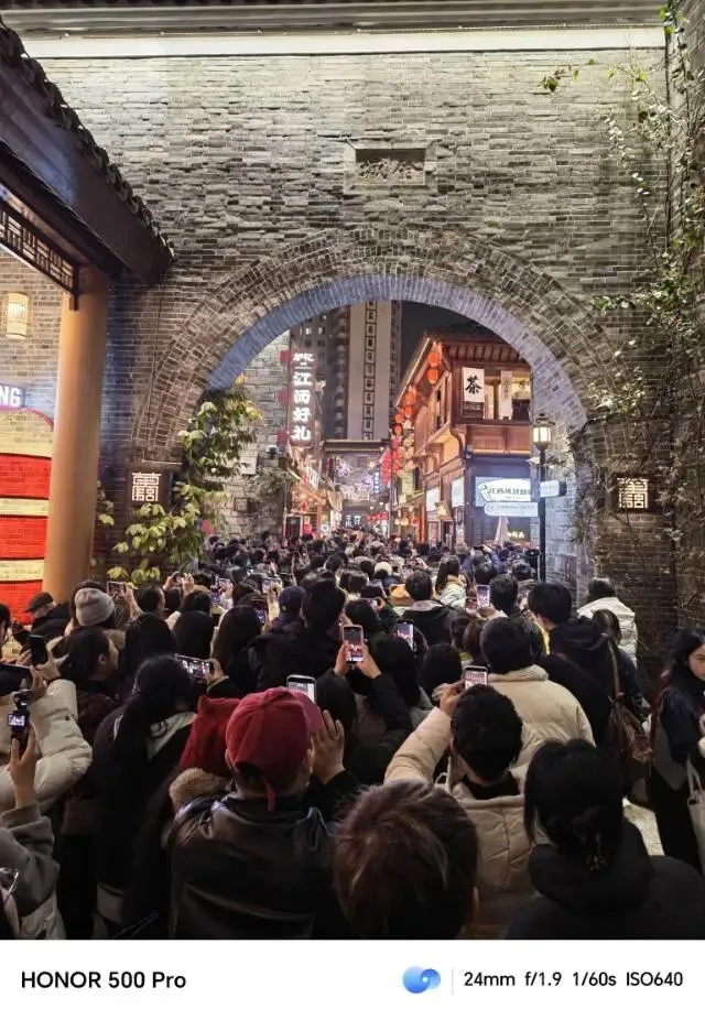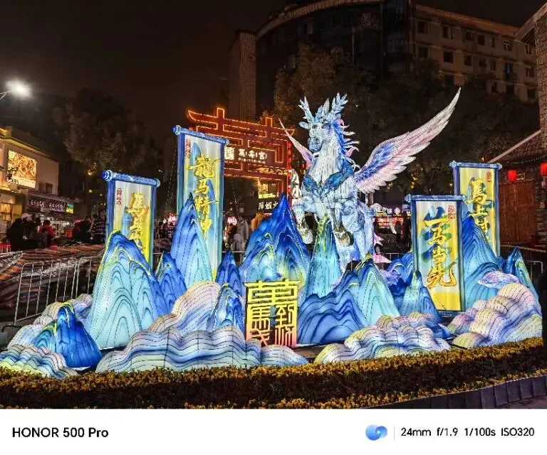 戏台上唱的内容,我一句也听不真切,一来人声嘈杂,二来我本就不懂戏曲,难品其中韵味。真正吸引我的,是戏台下一组栩栩如生的马形彩灯,不少人背对着镜头拍照留念,我也凑了上去。刚举起手机,就有路人上前,麻烦我帮忙拍一张全家福。我欣然答应,接过手机连拍好几张,把手机还给对方后,自己对着景也拍了几张,便继续沿街漫步。