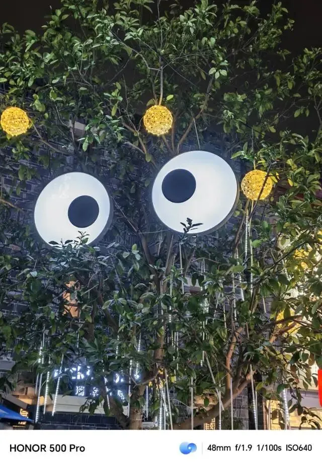路过一棵挂了形似双眼灯饰的树,树下一对母子正歇脚。母亲低头翻看手机里的照片,孩子捧着一串糖葫芦,吃得一脸满足,画面温馨又惬意。