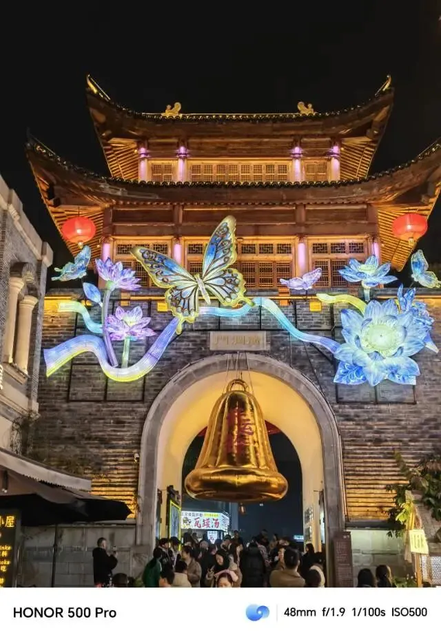 再往前,便是一座城门楼,门顶中央挂着一枚金色铃铛,上面印着“开运铃”。路过的人纷纷踮脚、起跳,伸手去触摸。我走上前,不用起跳便轻松碰到,铃铛不高。门楼上装饰着花朵与蝴蝶造型的彩灯,流光溢彩,格外好看。走出城门,抬头看见门楼上三个字:广润门。