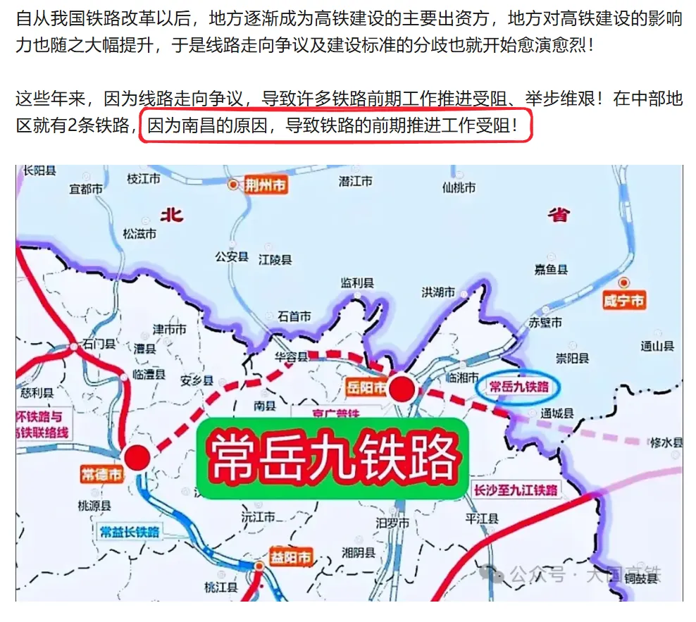 这两天刷到一篇文章中部改线大师南昌,导致常岳九铁路推进受阻,引起长九高铁线路争议。