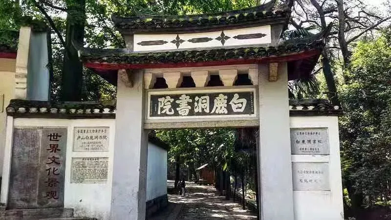 白鹿洞书院并没有洞,书院之脉从五老峰来,绝壁悬天,一峰南下。居高俯看,四山环合,一水中流,象是注入一个巨大的洞穴。那一山,就是中间的后屏山;那一水,就是流经山南的贯道溪。白鹿洞书院倚山临溪,古木蔽天,流水潺潺,殿堂巍立.翰墨留香,步人其中就仿佛来到阆苑仙境一般。