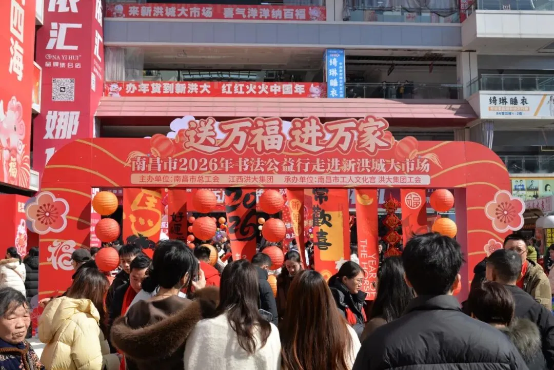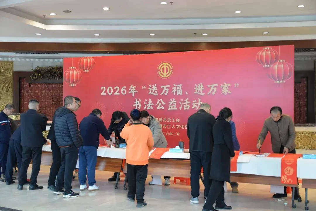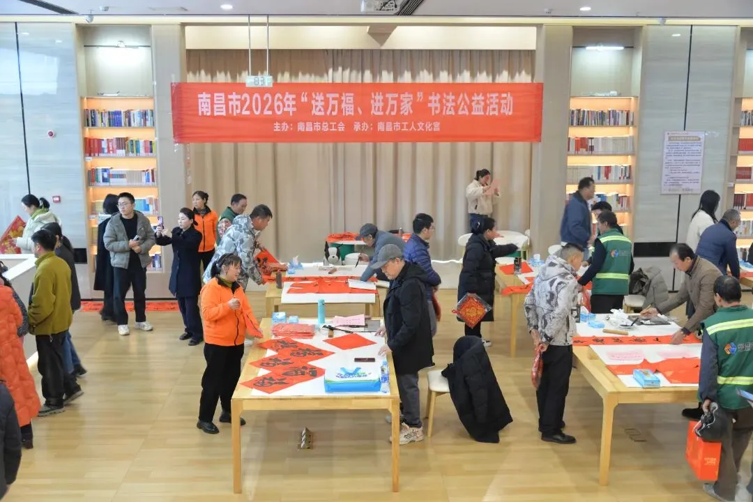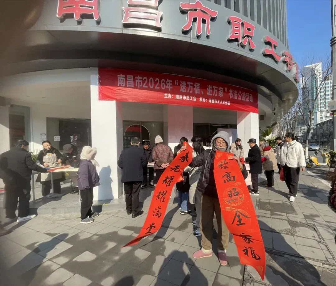 红红春联传递温暖,工会关怀情满洪城。由南昌市总工会主办、南昌市工人文化宫承办的2026年“送万福、进万家”书法公益活动火热开展,活动不仅为全市职工送上大红福字,更贴心为新就业形态劳动者、快递小哥、环卫工人等一线群体精心准备春联,把浓浓年味与工会温情送到各行各业职工和劳动者的心坎上,让大家在喜庆祥和中真切感受到工会组织的温暖。