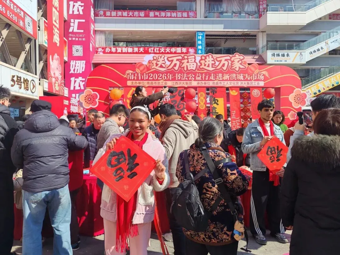 同时,文化宫马不停蹄地把福字和春联带到了新洪城大市场,活动现场吸引了数千名职工群众参与接福,其中还有外国友人热情参与,气氛热烈、人气火爆,为新春增添了一抹多元文化交融的亮色。