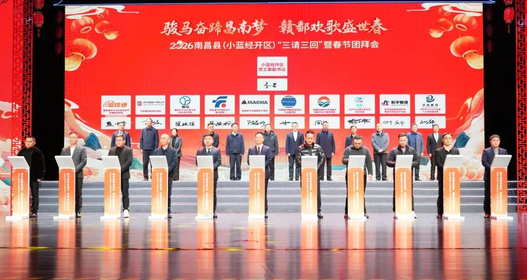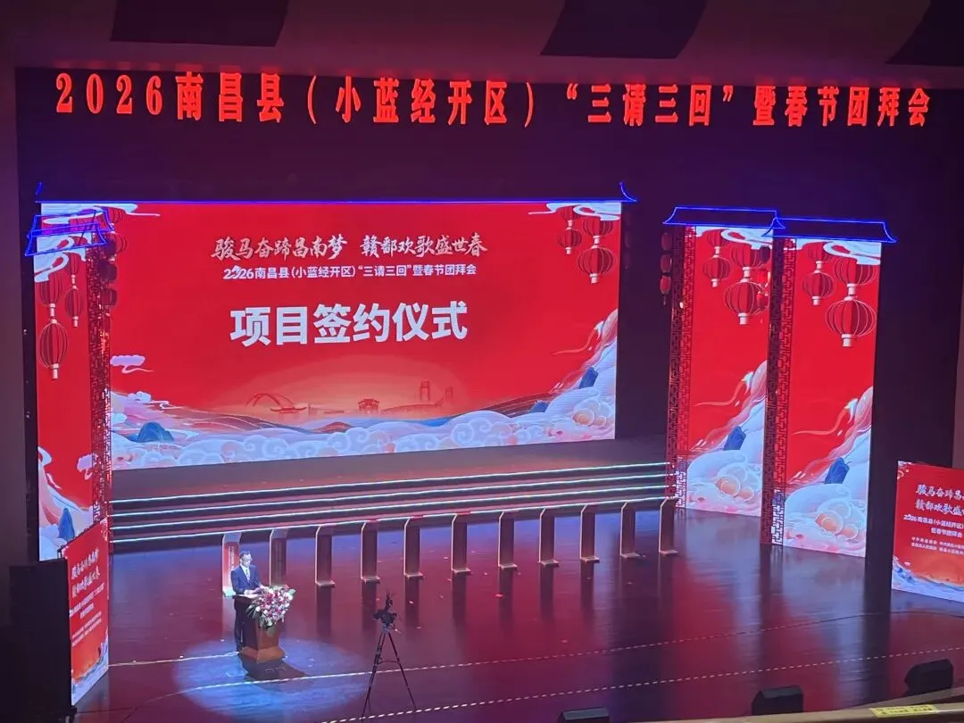 活动由县委副书记邓之武主持。县委书记、小蓝经开区党工委书记贾彧超发表致辞,岁月为证、奋斗有痕,感恩一路同行相伴。面对复杂多变的外部环境,艰巨繁重的发展任务,县(区)顶压前行、克难奋进,2025年GDP保持了“高基数上快增长稳增长”的积极态势,顺利完成“十四五”主要目标任务,连续16年稳居全省第一。同时,他强调今天的昌南,拥有全省工业门类最齐全的国家级开发区,拥有利通八方的国家级物流枢纽,拥有全国一次性批复泊位最多、岸线最长的内河港口码头,希望大家继续支持家乡发展、投身家乡建设,发挥自身的渠道、人脉、资源优势,把更多商机带回家乡,把更多项目带回家乡,推动更多优质资源向县(区)汇集。随后,县委副书记、县长,小蓝经开区党工委副书记、管委会主任帅志通报2025年南昌县(小蓝经开区)经济社会发展情况,介绍了投资环境政策,进一步强化了嘉宾们深耕这片投资沃土,与机遇同行的信心。在活动现场举行的签约仪式上,共集中签约项目30个,总金额达152.6亿元。签约项目清单星光熠熠:既有以麦格纳、阿里巴巴为代表的全球领军企业,也有富亿达、奇政模具等深耕细分领域的“专精特新”力量,更不乏意大利米兰STYLITALY、香港众拓等外资的青睐,彰显了强大的“磁吸力”。这批项目投资体量大、产业能级高、发展潜力足,将为南昌县(小蓝经开区)的产业转型升级与高质量发展注入新动能、激发新活力。文艺汇演以一幅生机盎然的昌南新春画卷徐徐展开。开场舞《春到福来昌南年》送来吉祥如意的真挚祝福;深情的朗诵《星光满天》,吟诵出这片土地的独特韵味与文化积淀;传统情景表演《非遗焕新彩》,则让古老技艺焕发现代活力,绘就昌南发展的蓬勃新气象。紧接着,激昂的民乐《马年组曲》奏响奋进旋律,质朴的采茶戏《昌南茶韵·金马迎春》唱出了人民同心共创未来的坚定决心。最终,全场在恢弘歌舞《我们的新时代》中达到高潮,生动演绎了激昂的时代精神与携手共赴新征程的壮阔情怀。此次 “三请三回” 暨招商推介项目签约活动,不仅是一次投资签约的盛会,更是一次情感交流的聚会。我会的代表们通过参与活动,进一步加强了与各界人士的联系与合作,商会也将以此为契机,不断开拓进取,团结带领广大新生代企业家,助力家乡在经济发展、社会进步等各个方面取得更加优异的成绩!