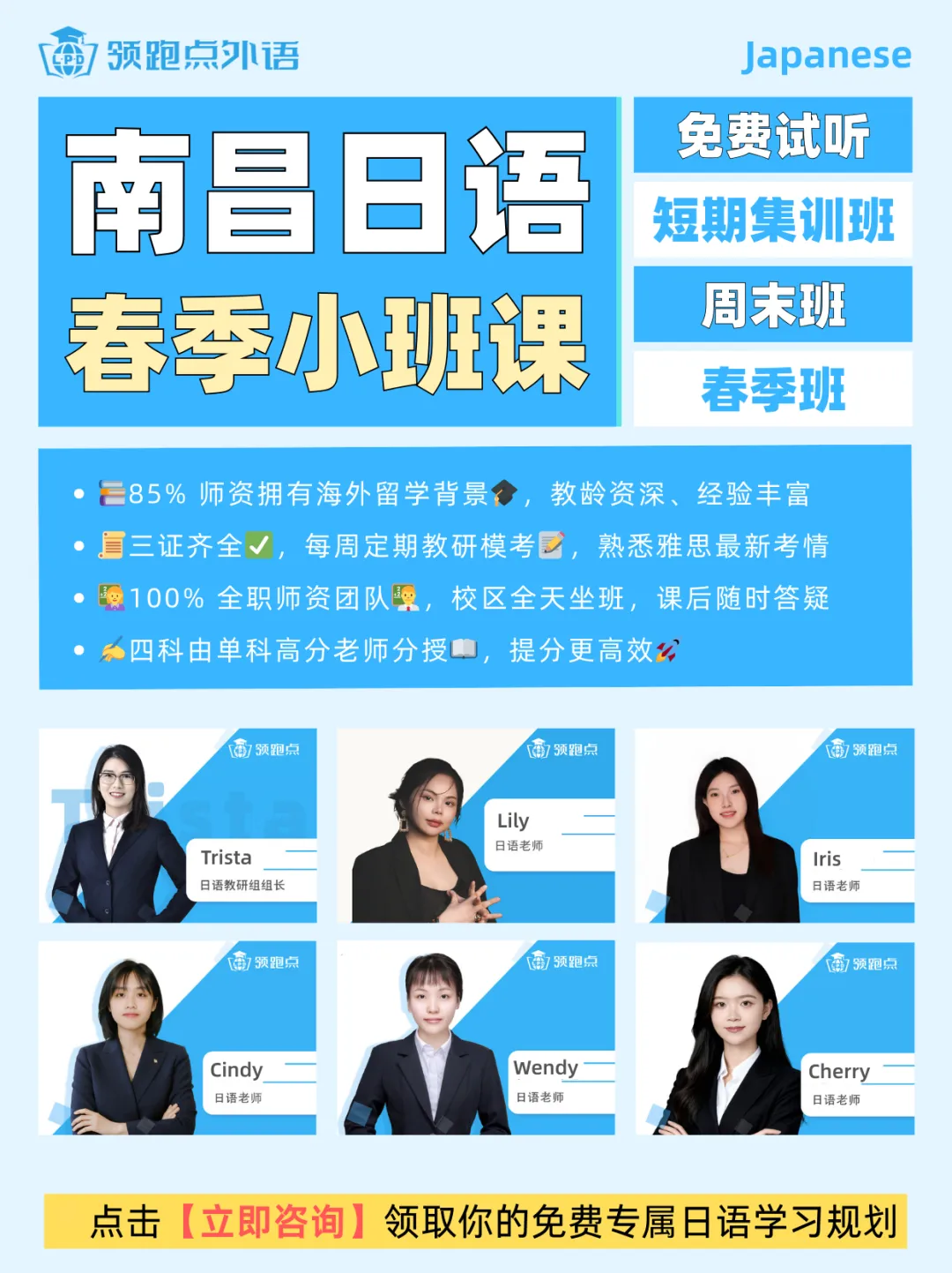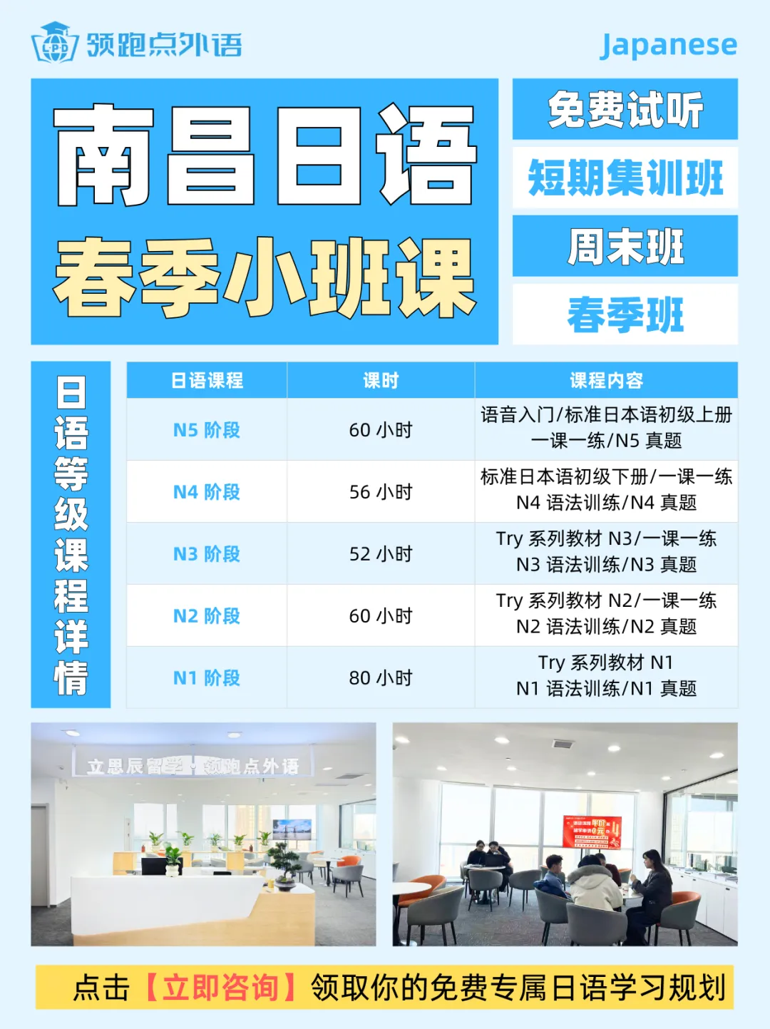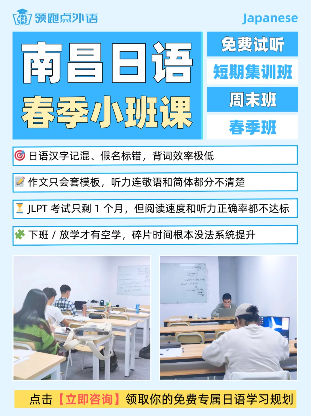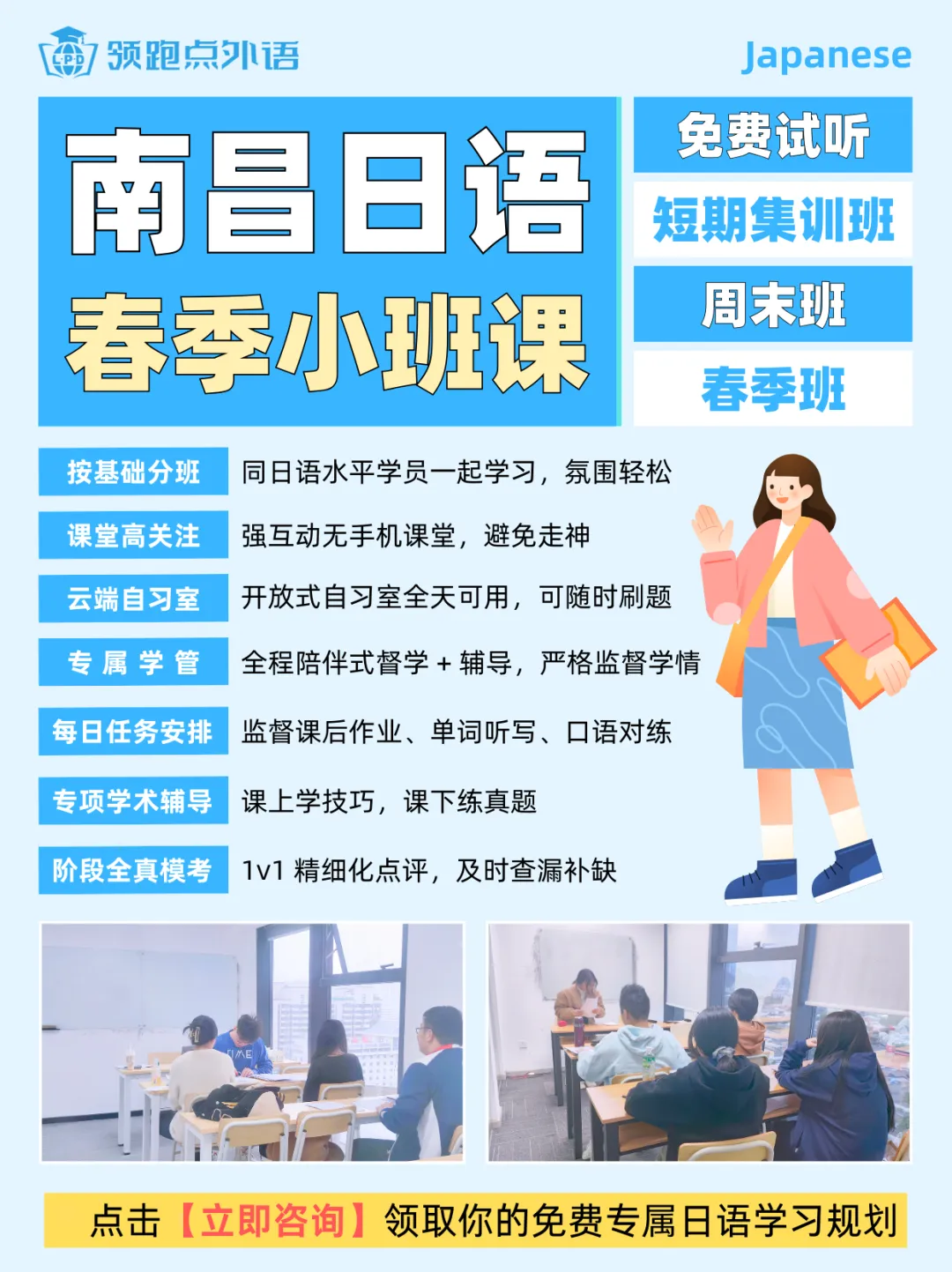 在全球化浪潮下,日语学习早已不再局限于兴趣爱好,而是成为升学、就业、留学的重要竞争力。无论是备战JLPT考试,还是为赴日留学、工作做准备,系统、高效的日语学习都至关重要。领跑点外语立足南昌本地,凭借专业的师资、科学的课程体系和贴心的教学服务,推出南昌日语春季小班课,为每一位日语学习者量身定制成长路径,助力大家在日语学习的道路上稳步前行。