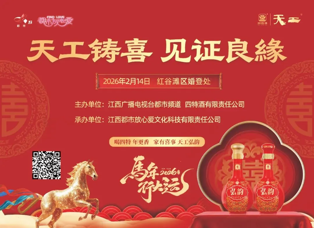 2026年2月14日,江西广播电视台都市频道联合四特酒有限责任公司,在南昌红谷滩婚姻登记处,共同开启一场有酒、有声、有喜的特别仪式,为每对新人铺开一条从“领证”到“礼成”的温情之路,见证爱情的长长久久。