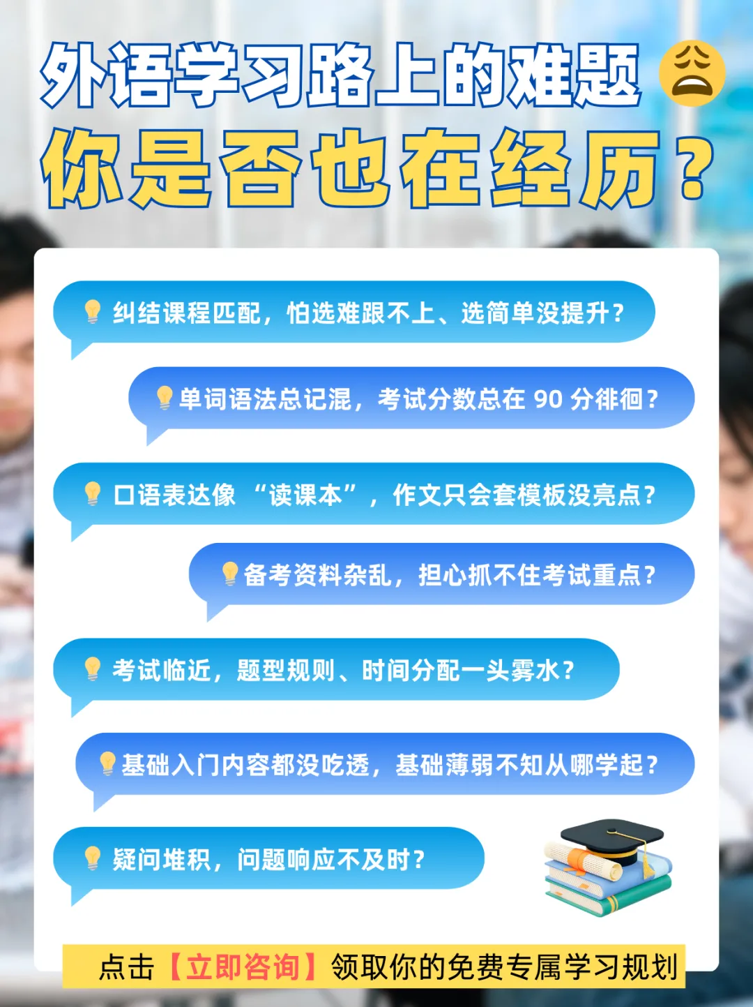 在语言学习中,许多人都曾经历过 “努力却无成效”的困境:纠结课程匹配度,担心选难跟不上、选简单没提升;单词语法总记混,考试分数在90分徘徊;口语表达像“读课本”,作文只会套模板;备考资料杂乱,抓不住考试重点……这些痛点,正是领跑点外语教学体系的核心突破点。