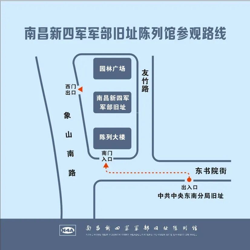 为优化您的参观体验,建议您合理规划行程,优先选择官方推荐路线进行参观:中共中央东南分局旧址→陈列大楼→南昌新四军军部旧址→园林广场。