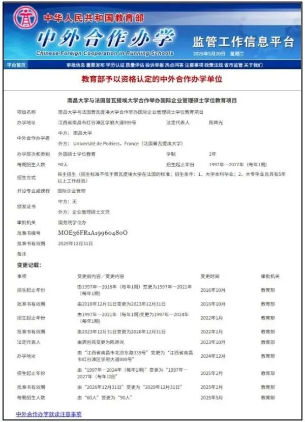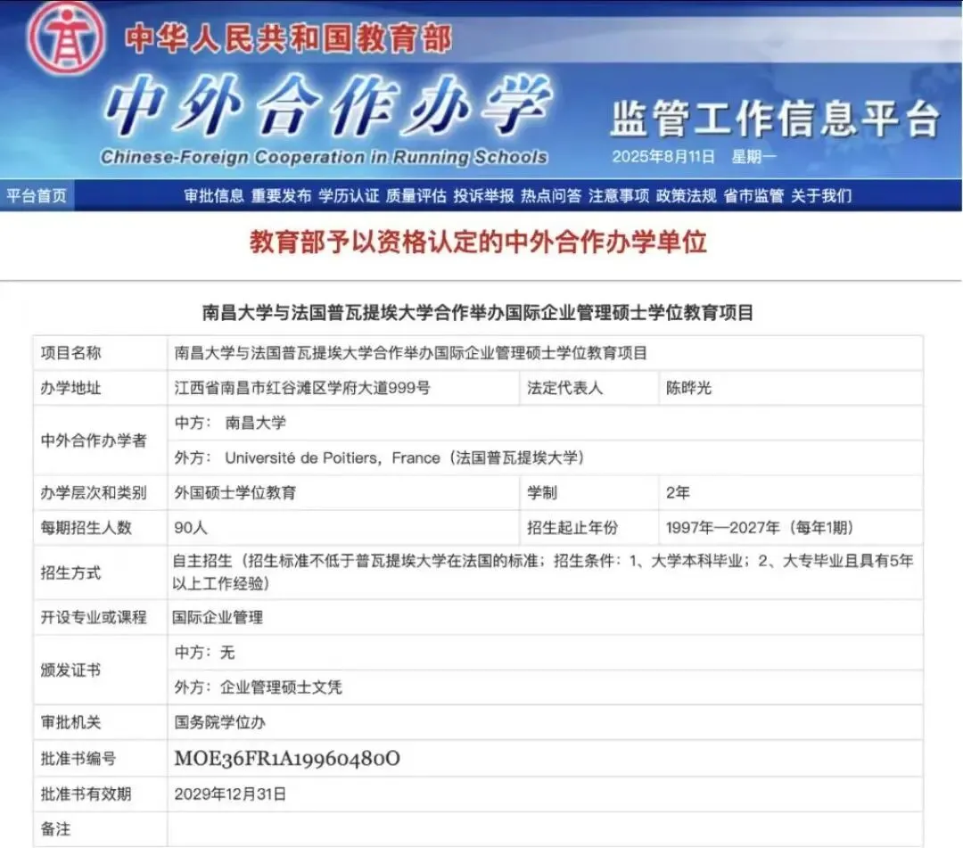 南昌大学与法国普瓦提埃大学合作举办的国际企业管理硕士项目(Master in International Business),是经国家教育部和江西省教育厅批准,该项目于1997年正式成立,被誉为"中法合作办学的典范",并两次通过教育部合格评估。