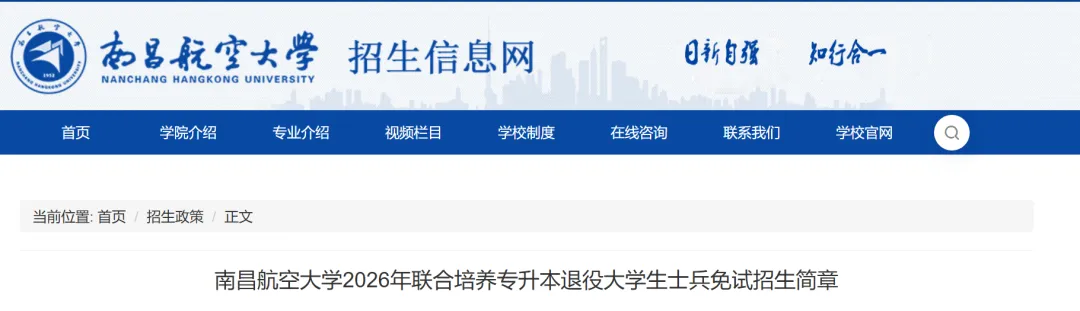 南昌航空大学2026年联合培养专升本退役大学生士兵免试招生简章