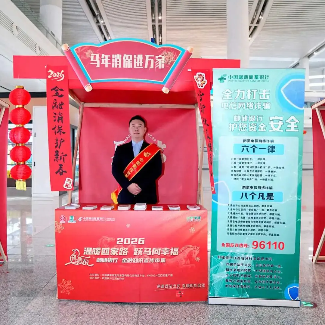 邮储银行江西省分行在西客站南进站口设立了“春运反诈宣传服务点”,为大家提供金融反诈咨询、反诈手册发放,真正践行“邮储银行江西省分行为您温暖守护”的承诺。