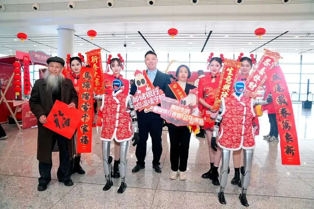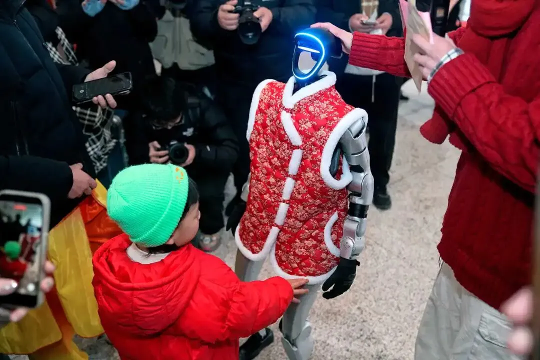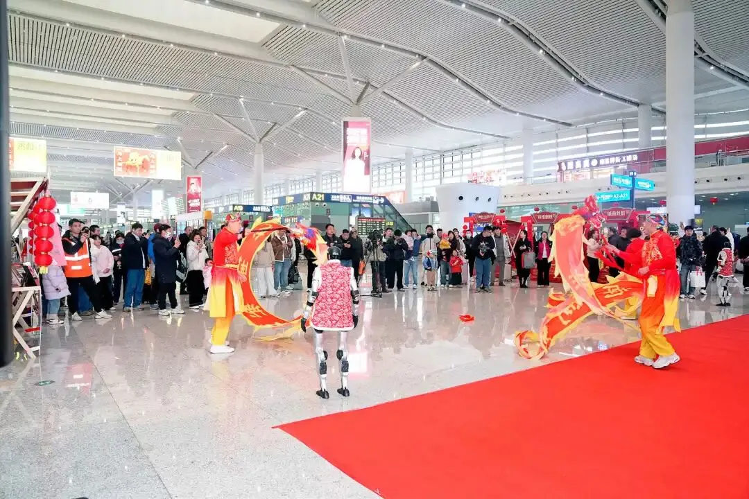 即将登上2026央视春晚的宇树科技u2人形机器人,以精准算法演绎灵动舞姿,让机械身躯迸发艺术张力,诠释科技时代之美。机器人现场与旅客互动合影,现场热闹非凡。