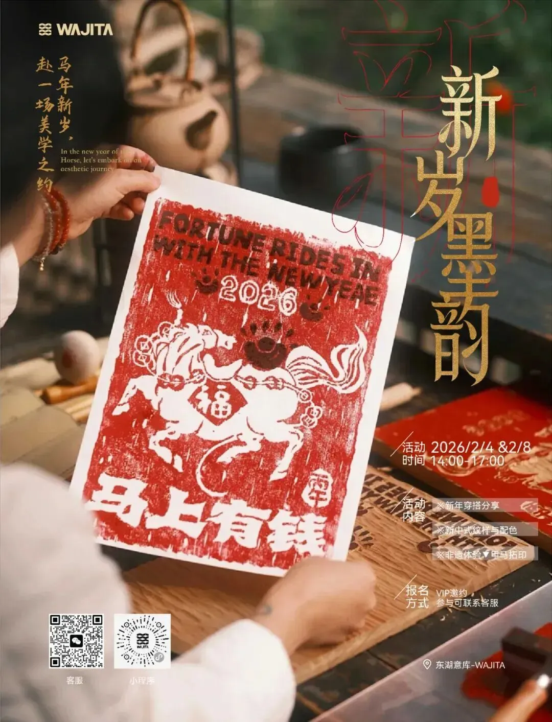 活动内容:瓦吉塔“新岁黑韵新中式穿搭沙龙”(2026年2月4日),陆上书店“爵醒计划爵士乐演出”(每周二至周日20:00-22:30)。