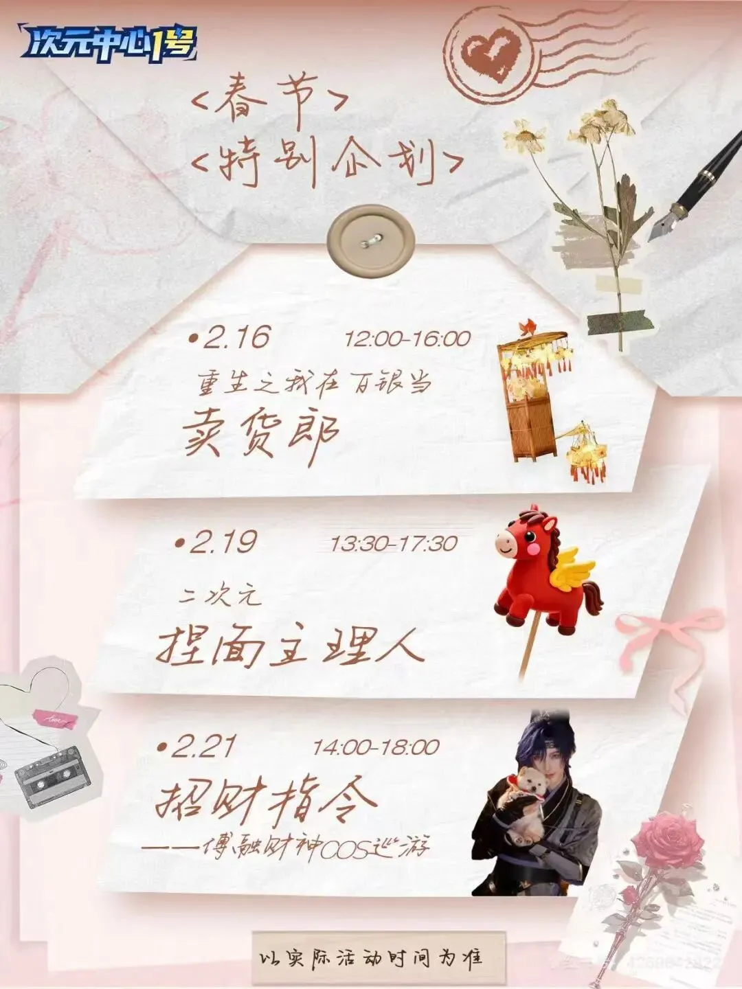 活动内容:开展卖货郎巡游、二次元捏面人、财迷副官巡游,围绕二次元、国风、动漫等元素,打造沉浸式跨次元体验。