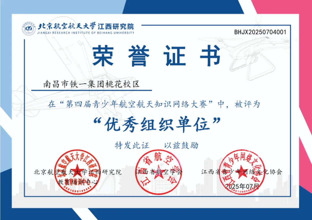【喜报】南昌市铁一集团桃花校区荣获“第四届青少年航空航天知识网络大赛优秀组织单位”称号