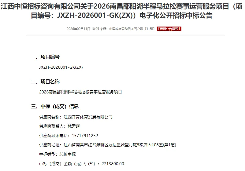 2026江西南昌鄱阳湖半程马拉松,江西汗青体育中标,标额271万,拟3月15日举办,B类认证