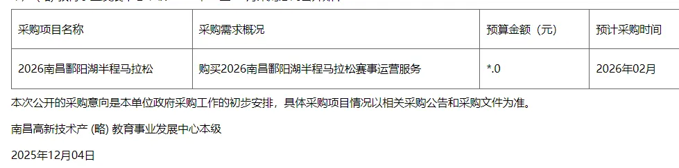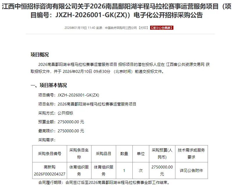 2026江西南昌鄱阳湖半程马拉松,开启招标,预算275万,拟3月15日举办,B类认证