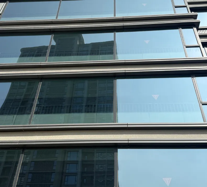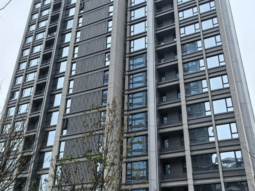 全公建化外立面,顶部还有外立面凸出的部分以及飘窗底部用了铝板,南阳台是三块大块的落地玻璃。
