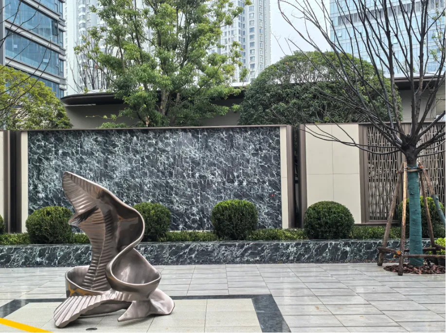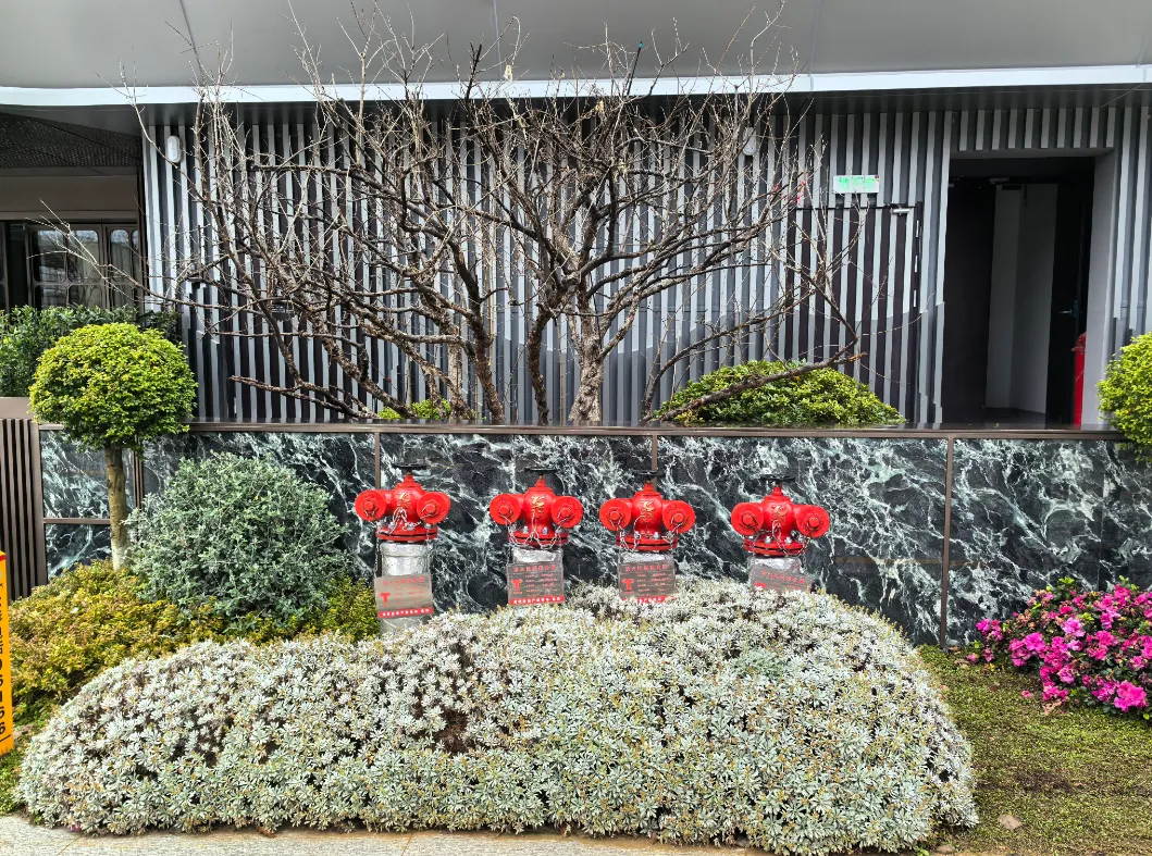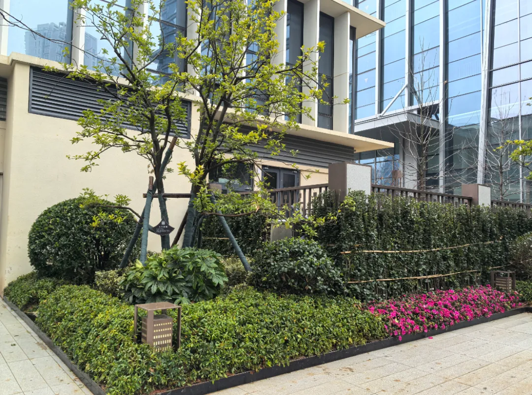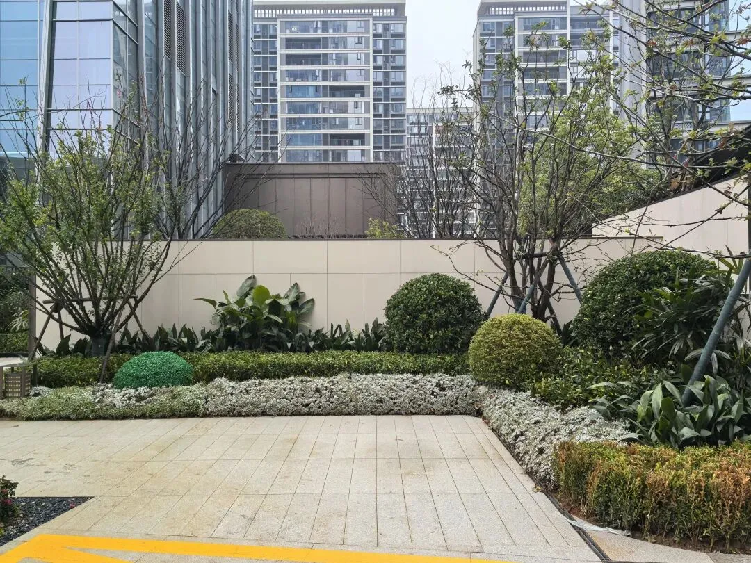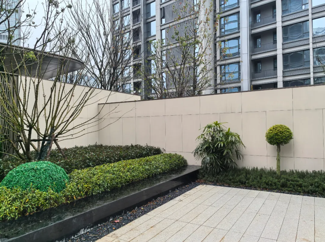 西面消防通道进来有一面景墙,景墙前面就运用了植物的高低搞了些层次感