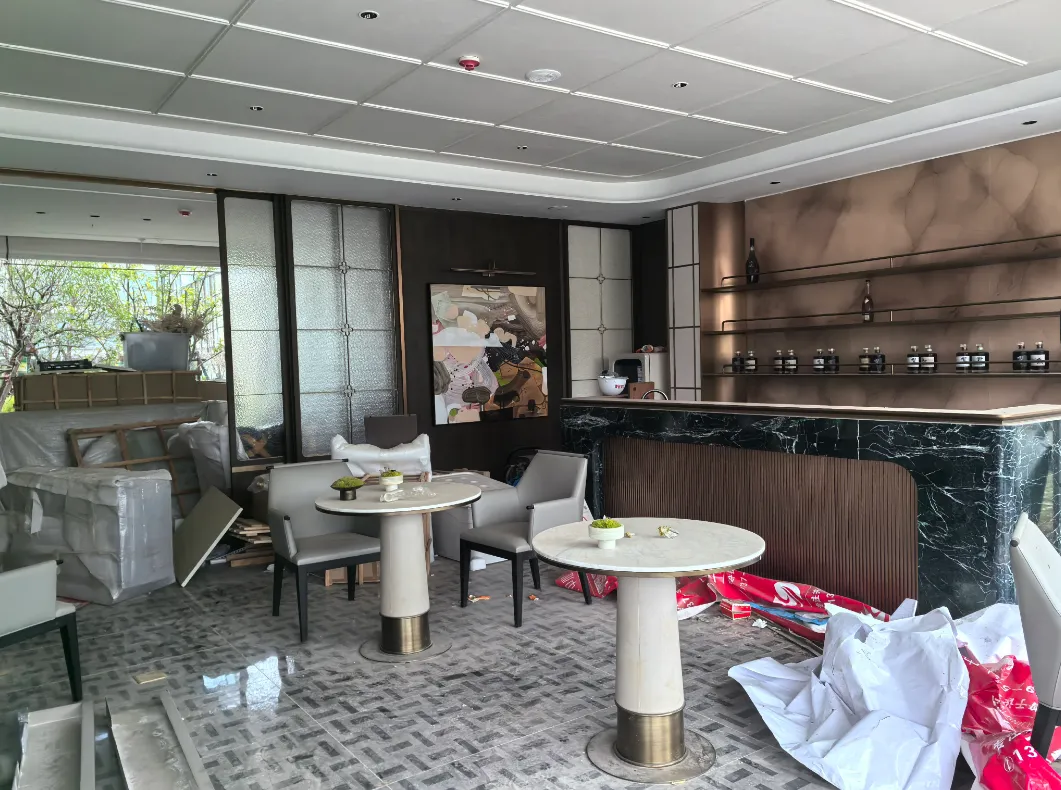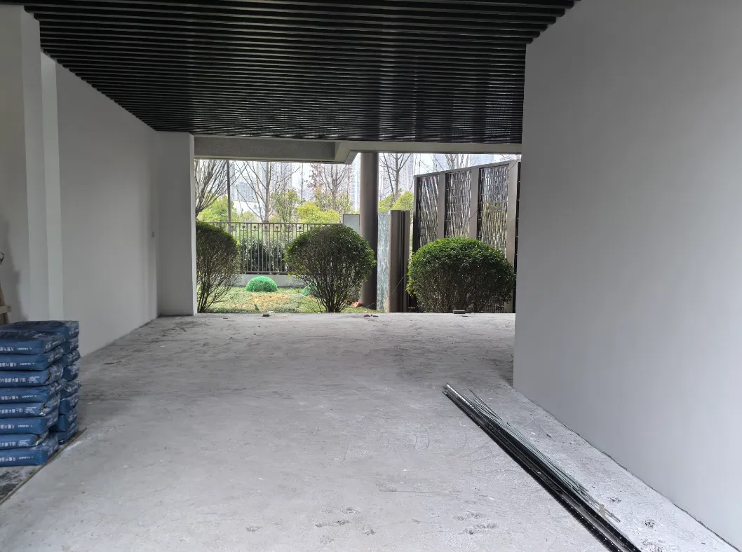 一边目前只做了格栅吊顶,地面和墙面都没有处理好,设施也没进。
