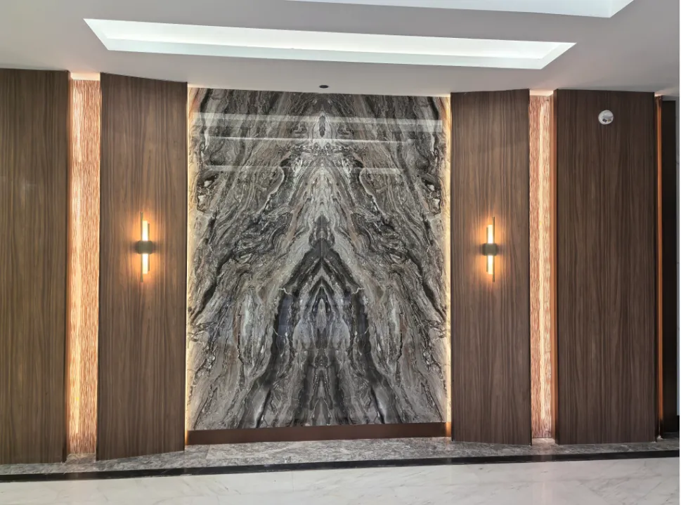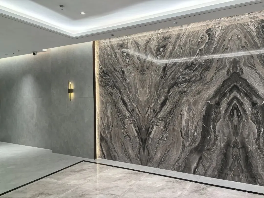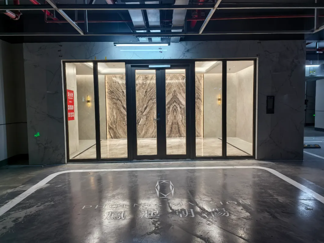 我也去地库转了一下,地下入户大堂跟地面基本如出一辙,同样的一面背景墙