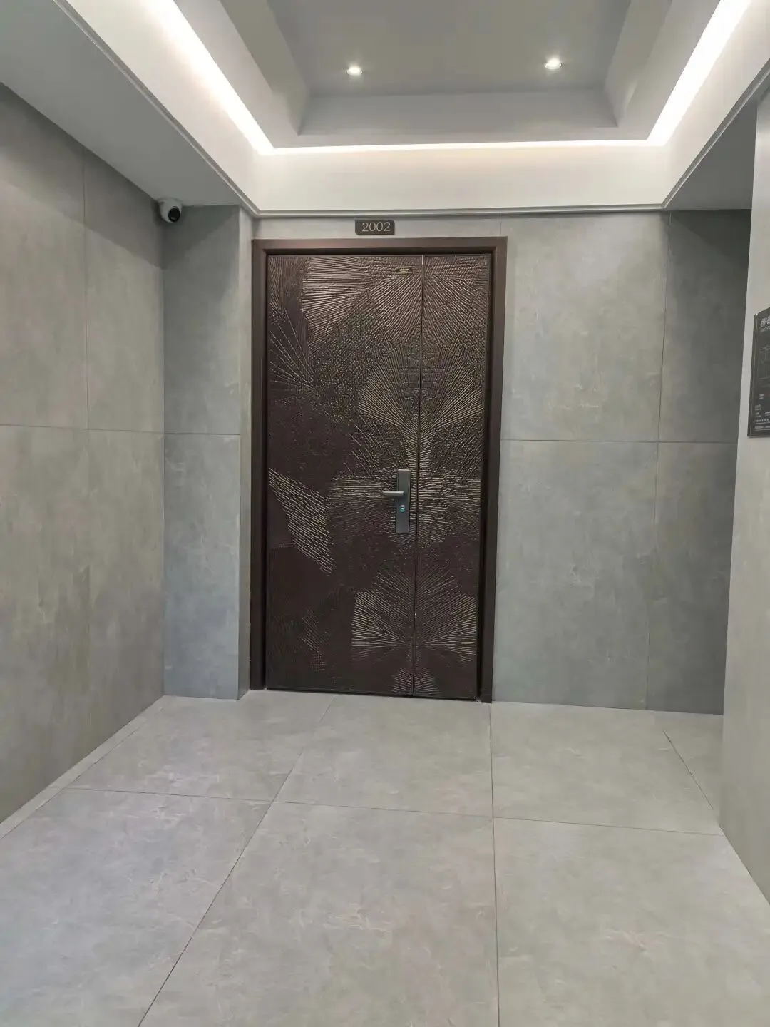 两梯两户的设计,电梯厅挺大的,也是瓷砖上墙。子母门,没有带指纹密码锁。