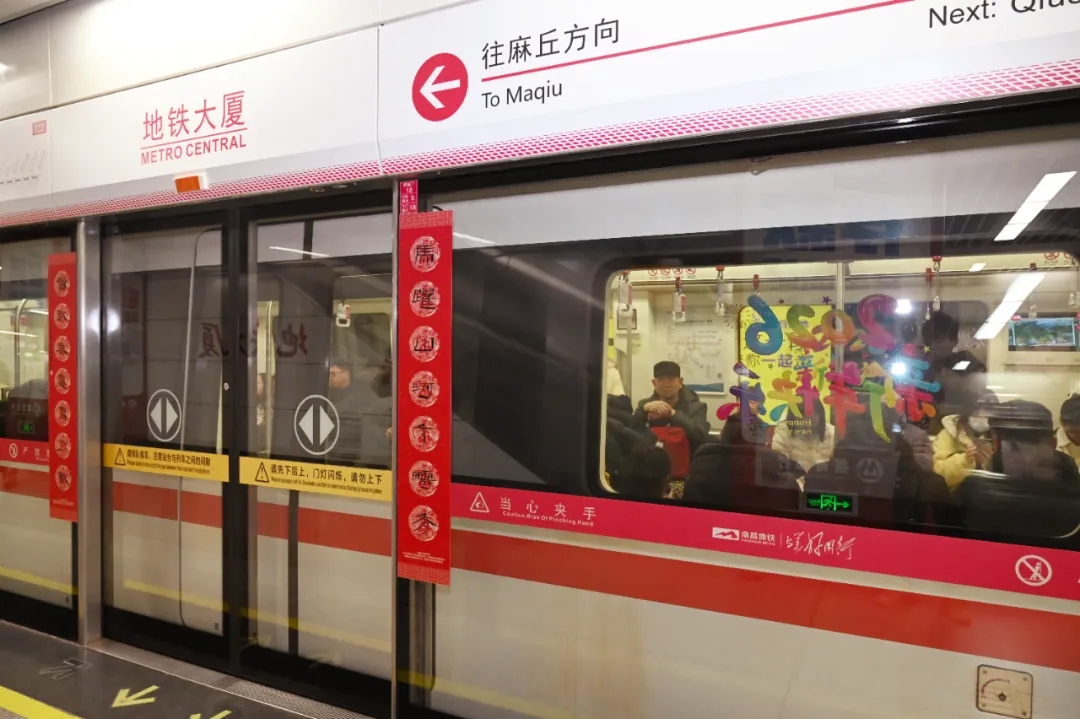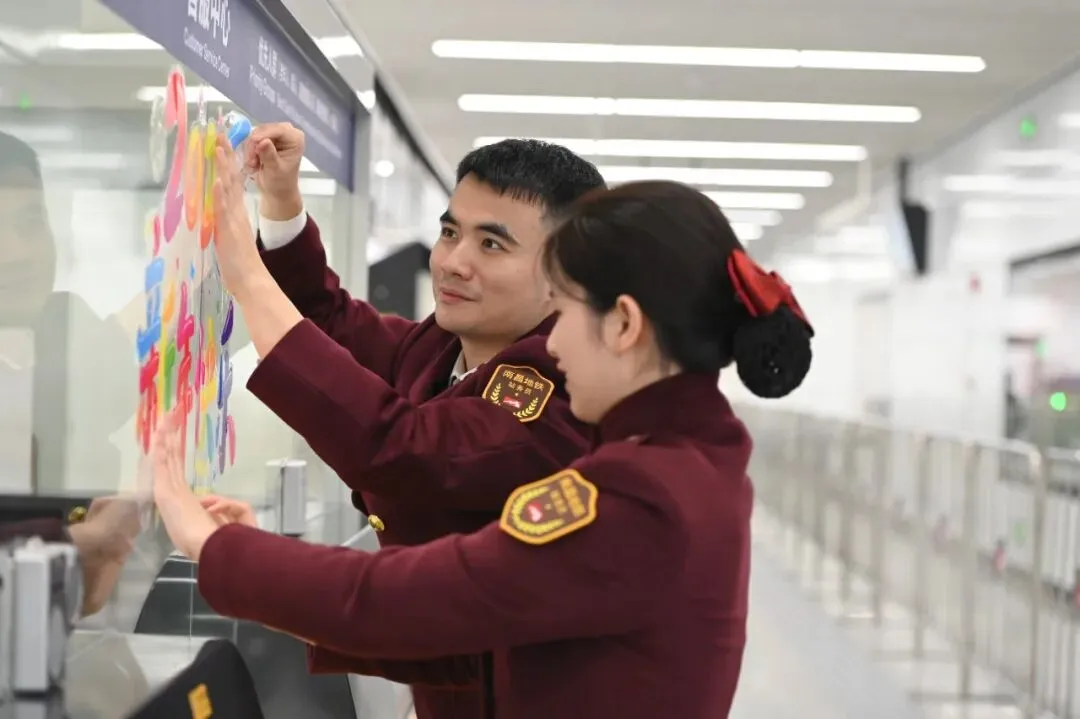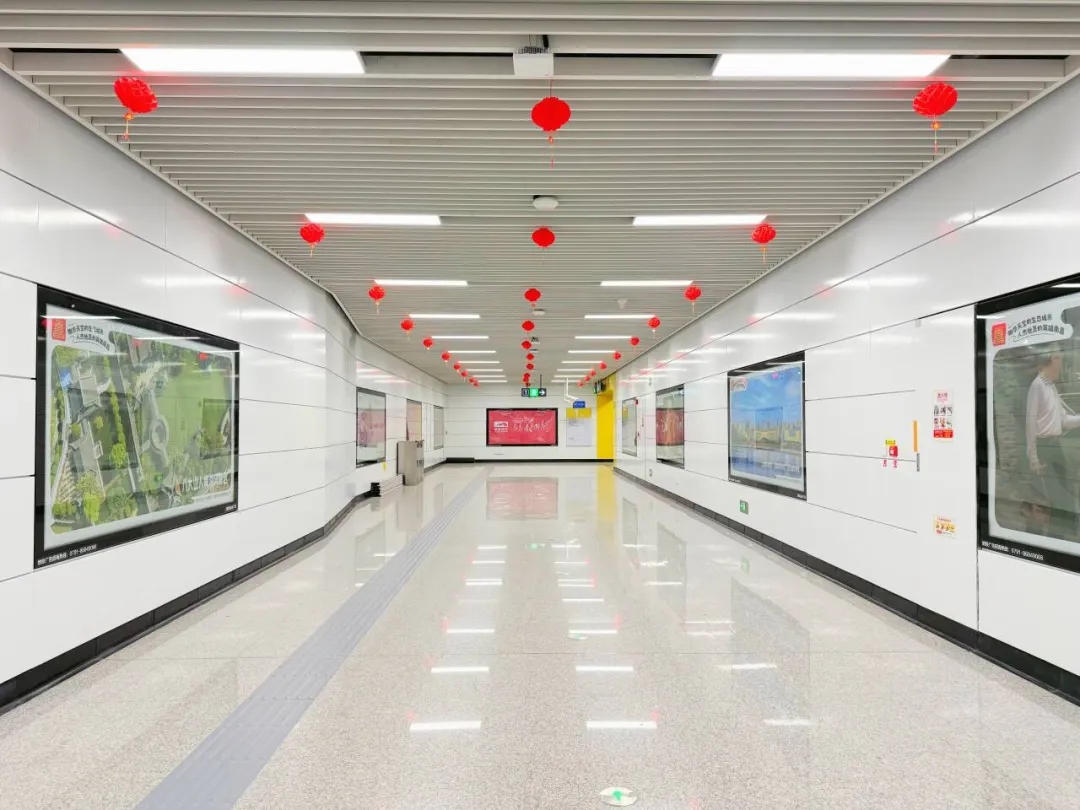 走进地铁站,浓浓的年味扑面而来。一串串红灯笼高高挂起,一抹抹“中国红”点亮车站,精巧的中国结垂挂其间,寓意吉祥的窗花与福字点缀各处,满站喜庆年味拉满传统仪式感。这些民俗元素与现代化车站设施相映成趣,传统韵味融于城市气息,让乘客踏入车站便沉浸在温馨祥和的节日氛围里。