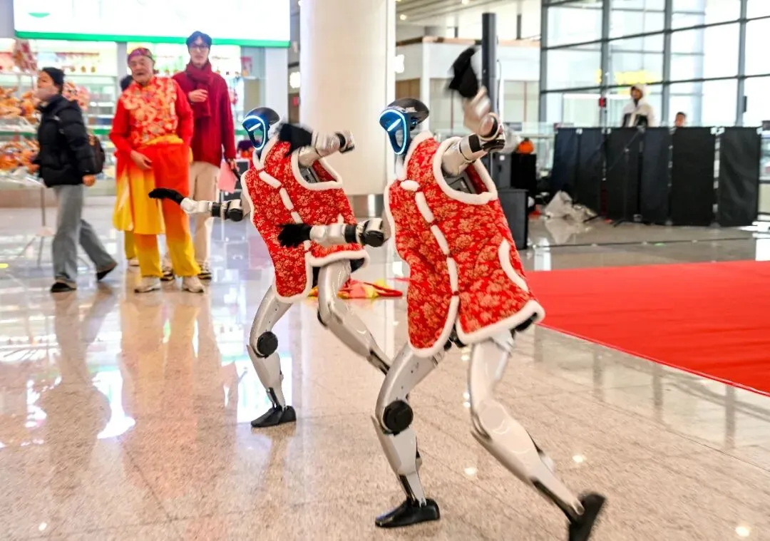 2026年2月10日,江西省南昌西站候车大厅内智能机器人为旅客表演舞蹈。鲍赣生 摄