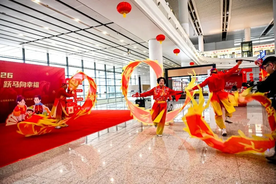 2026年2月10日农历北方小年,江西省南昌西站候车大厅内暖意融融,一场温馨的“非遗进车站”活动在此展开,为春运旅途增添了浓浓的年味。活动现场,城南龙灯腾跃起舞,新干剪纸巧手成花,宣纸刺绣静雅生辉。这些底蕴深厚的传统技艺,与智能机器人的灵动展示、书法家笔下春联的融融暖意交相辉映,共同勾勒出一幅传统与现代相融、人文与科技和鸣的温暖画卷。