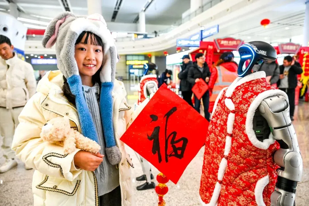 2026年2月10日,江西省南昌西站候车大厅内收到“福”的旅客与智能机器人互动。鲍赣生 摄