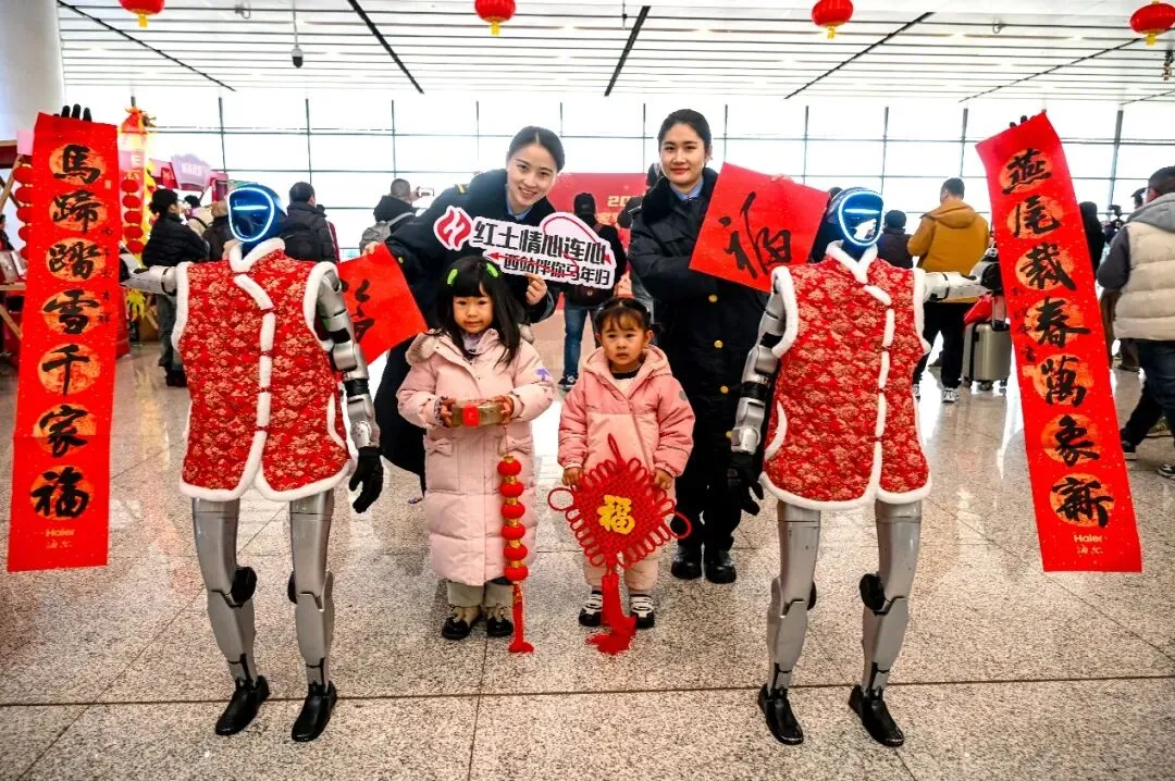 2026年2月10日,江西省南昌西站候车大厅内智能机器人手拿春联与旅客合影。鲍赣生 摄